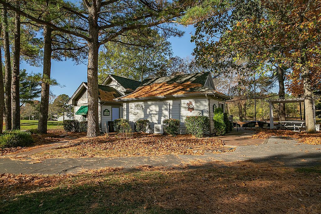 The exterior space of the snack bar features a charming white clapboard facade, accented by green trim around the windows and door. Surrounding the building, rich autumn leaves blanket the ground, creating a warm, inviting atmosphere. The roof is adorned with a subtle layer of leaves, hinting at the seasonal changes. A wooden deck wraps around the front, offering a casual spot for visitors. Lush bushes frame the entrance, adding greenery and softening the structure. Nearby trees provide shade, and the scene is serene, ideal for enjoying refreshments while immersed in a natural setting.