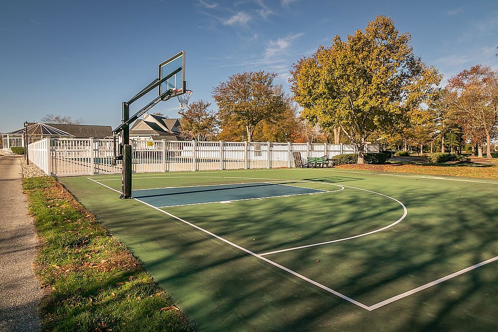 A well-maintained outdoor basketball court showcases a vibrant green playing surface bordered with white lines, demarcating the key and three-point areas. The sturdy black hoop stands tall at one end, with the net gently fluttering in the light breeze. Surrounding the court, a neat white picket fence adds a touch of charm while providing privacy. Lush trees with autumn foliage in shades of yellow and orange create a picturesque backdrop, enhancing the tranquil atmosphere of the space. The court is easily accessible via a paved pathway, inviting sports enthusiasts to enjoy friendly games in this scenic setting.