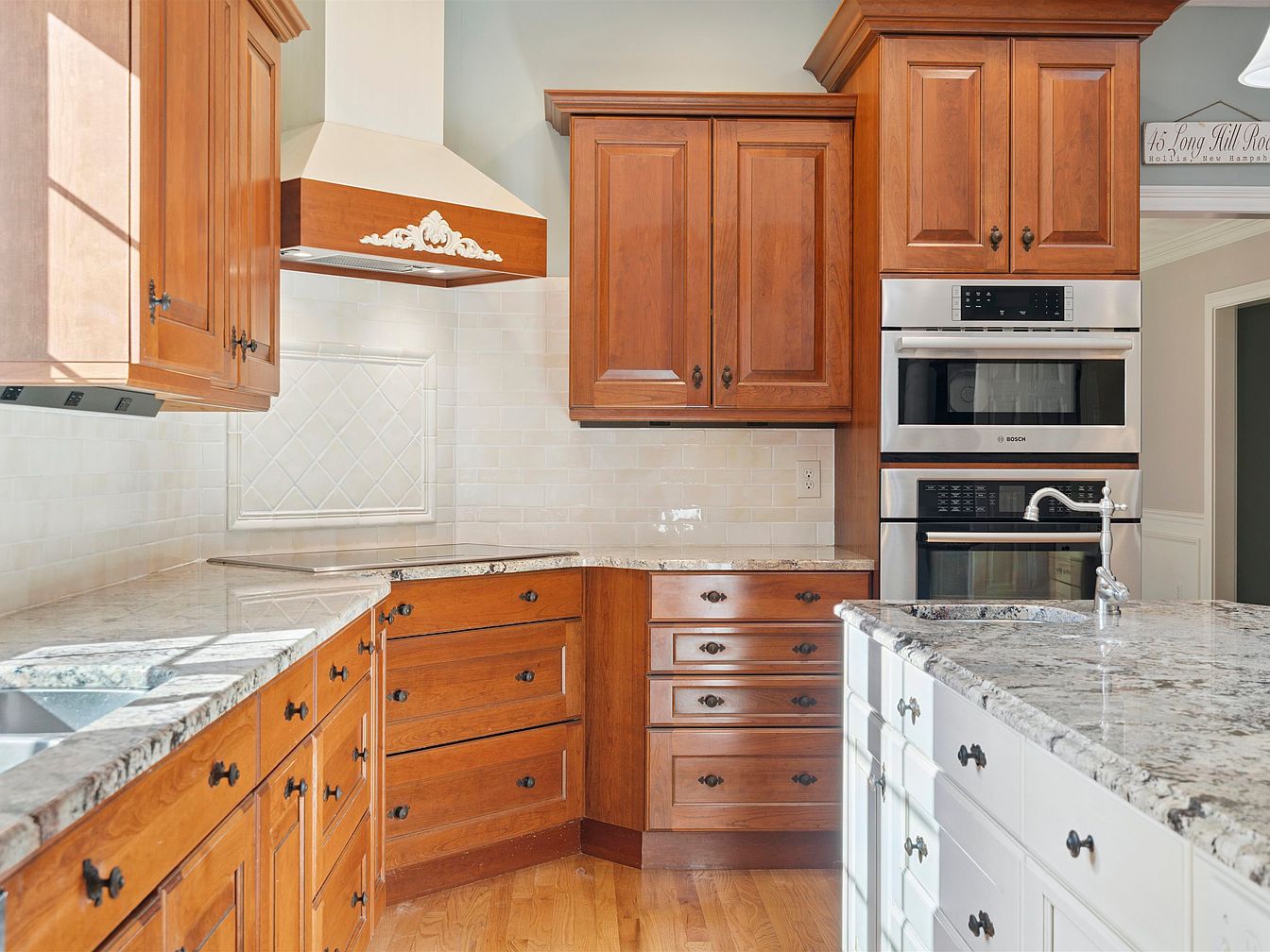 This kitchen features a harmonious blend of rich wooden cabinetry and modern appliances. The cabinets display a warm, reddish-brown finish, offering an inviting contrast to the light-colored backsplash made of small, glossy tiles. Countertops of polished granite showcase swirling patterns in gray and white, enhancing the room’s elegance. A central island provides additional workspace, while stainless steel appliances, including double ovens and a sleek range hood, seamlessly integrate into the design. Ample light floods the area through a nearby window, highlighting the refined architectural details, such as the decorative insert above the stove, which adds character to the space.
