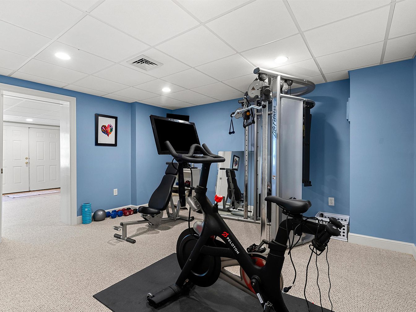 This home gym features a tranquil atmosphere with soft blue walls, creating a calming environment. In the foreground, a sleek black Peloton bike and a multi-use gym machine showcase modern fitness technology. Decorative elements include a framed artwork featuring a colorful heart, adding a personal touch. The space is well-lit with recessed ceiling lights, enhancing visibility and motivation. Warm-toned carpet flooring provides comfort, while various exercise equipment like dumbbells and a yoga mat offer functionality. The layout promotes an efficient workout area, with an inviting view towards the entryway, fostering a sense of openness.
