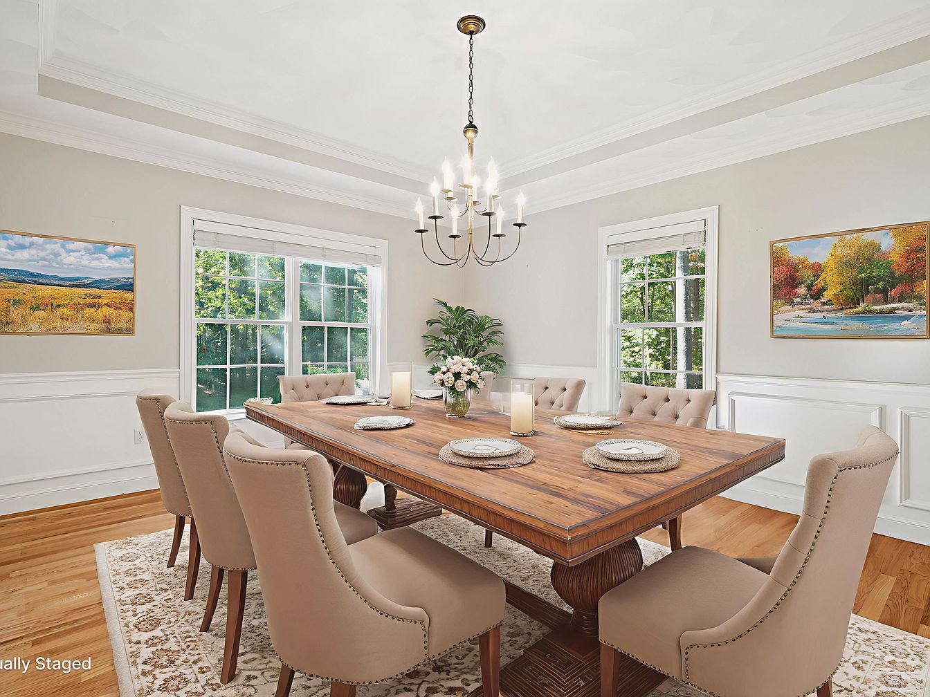 Spacious dining room featuring a large wooden table surrounded by plush, beige upholstered chairs. The table showcases a rich, warm wood grain, adding a touch of elegance. A contemporary chandelier hangs overhead, illuminating the space with soft light. Two large windows frame the room, allowing natural light to flow in, highlighting the light gray walls adorned with white wainscoting. On one wall, a picturesque landscape painting complements the calming aesthetic, while potted greenery adds freshness. A patterned area rug in soft tones anchors the table, enhancing the inviting yet sophisticated atmosphere, perfect for gatherings.
