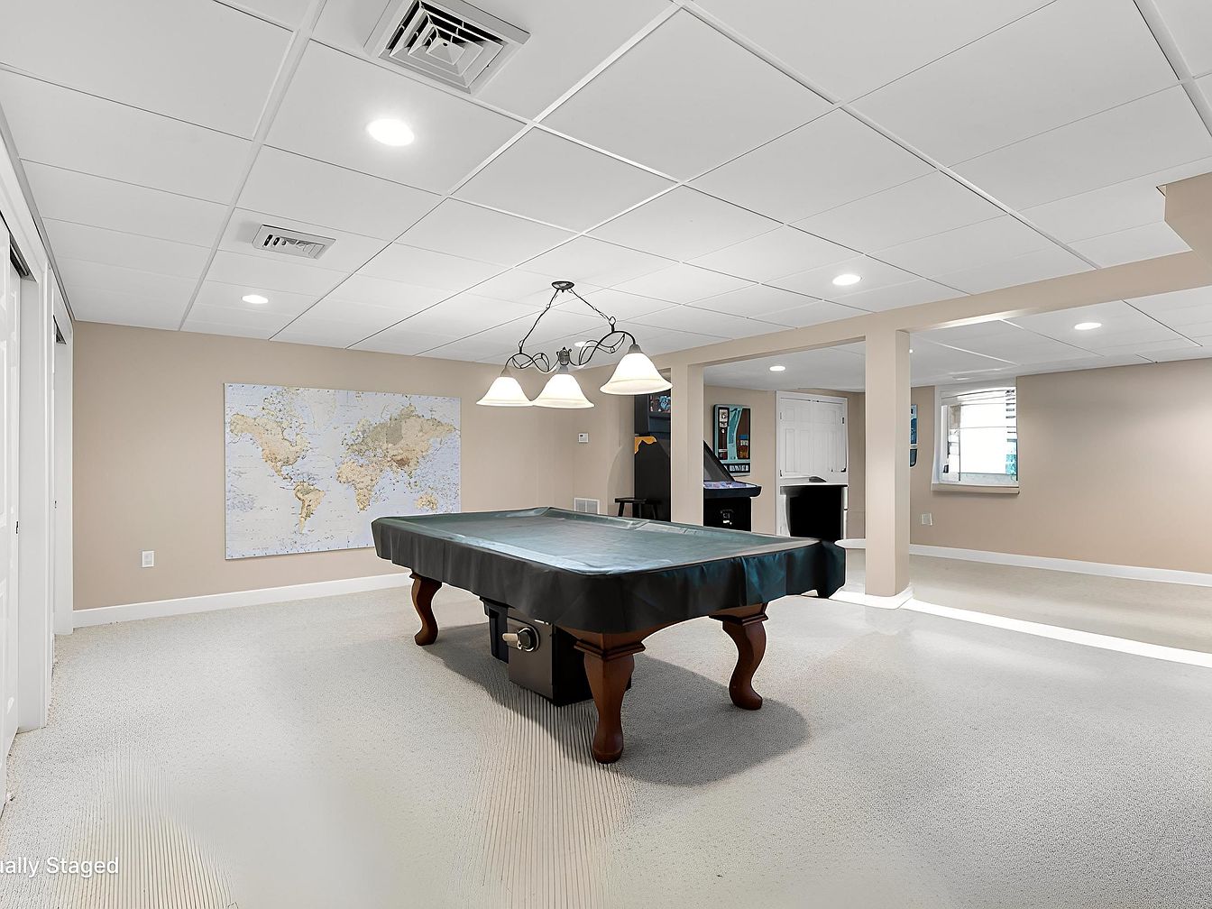 This spacious game room features a pool table at its center, illuminated by a modern chandelier with three bulbs. Soft beige walls complement the light gray carpet flooring, enhancing the room’s bright and inviting atmosphere. A large world map decorates one wall, contributing a touch of decor amid the simplicity. Adjacent to the pool table, a desk area is set up in the back with a black chair and framed artworks, creating an appealing and recreational environment. The layout facilitates both leisure and social interaction, perfect for entertaining guests or enjoying casual games.