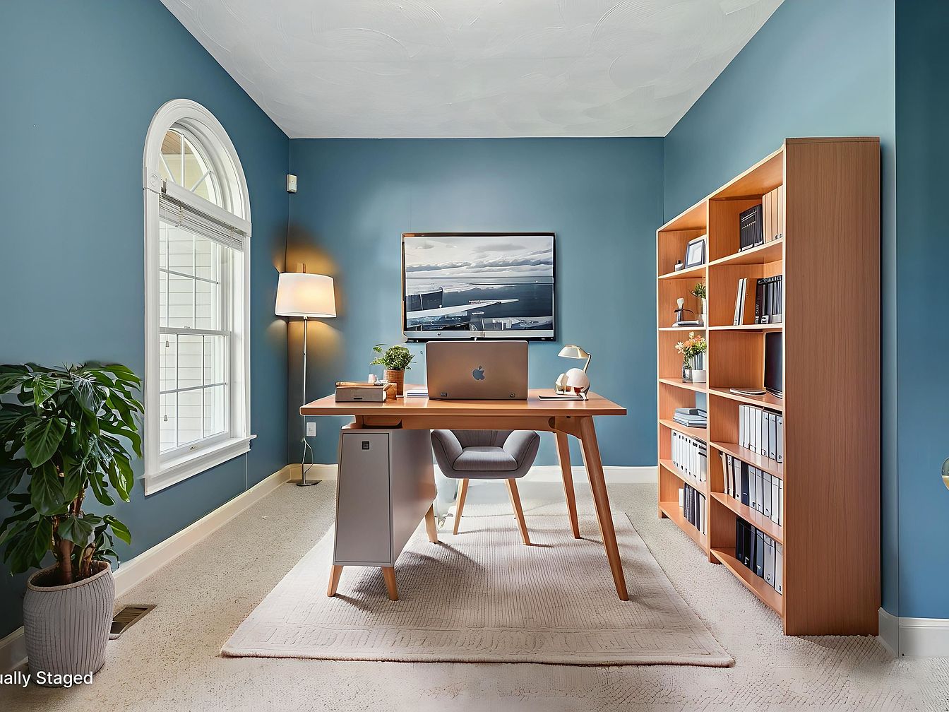 A cozy home office features rich blue walls that create a vibrant, stimulating atmosphere. The layout includes a streamlined wooden desk centered in the space, complemented by a light gray ergonomic chair. A large monitor displays a serene landscape, enhancing the workspace’s focus. To the side, a sleek bookshelf showcases neatly arranged folders and decorative items, while a stylish floor lamp illuminates the corner. A decorative potted plant adds a touch of nature, balancing the modern aesthetic. Soft beige carpeting contrasts the darker hues, providing warmth and comfort, ideal for productivity in this inviting setting.