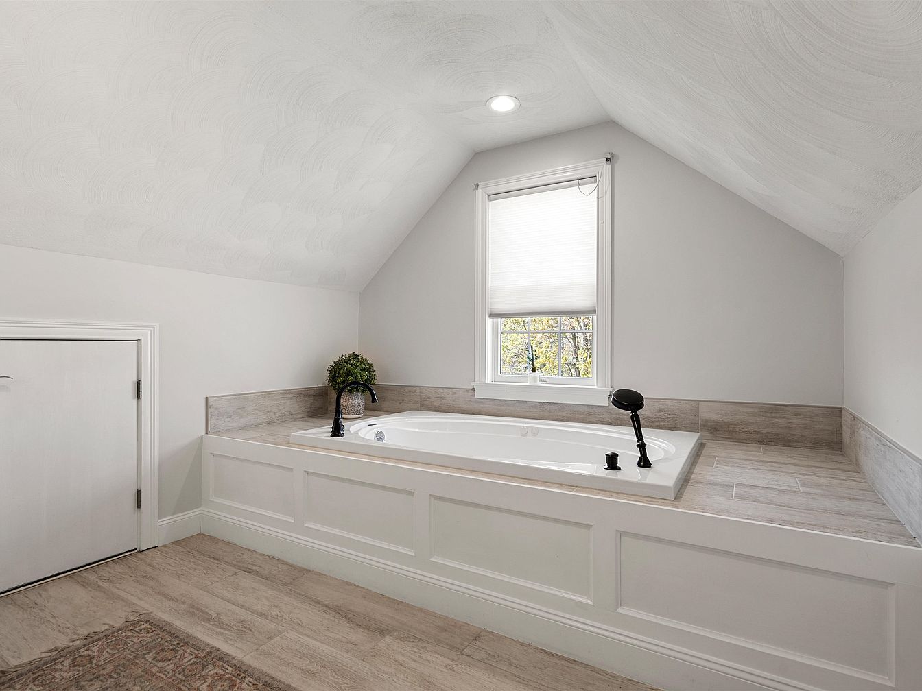 The master bathroom features a sloped ceiling with a soft texture, enhancing the cozy feel. The color scheme is predominantly light, with white walls complemented by light wood-grain tile flooring. A spacious soaking tub is set against a backdrop of neutral tones, accented by a sleek black faucet. Natural light pours in through a window dressed with simple blinds, illuminating a small potted plant adding a touch of greenery. Wainscoting frames the tub area, highlighting elegant architectural details. A discreet door leads to additional space, maximizing functionality and charm in this serene retreat.