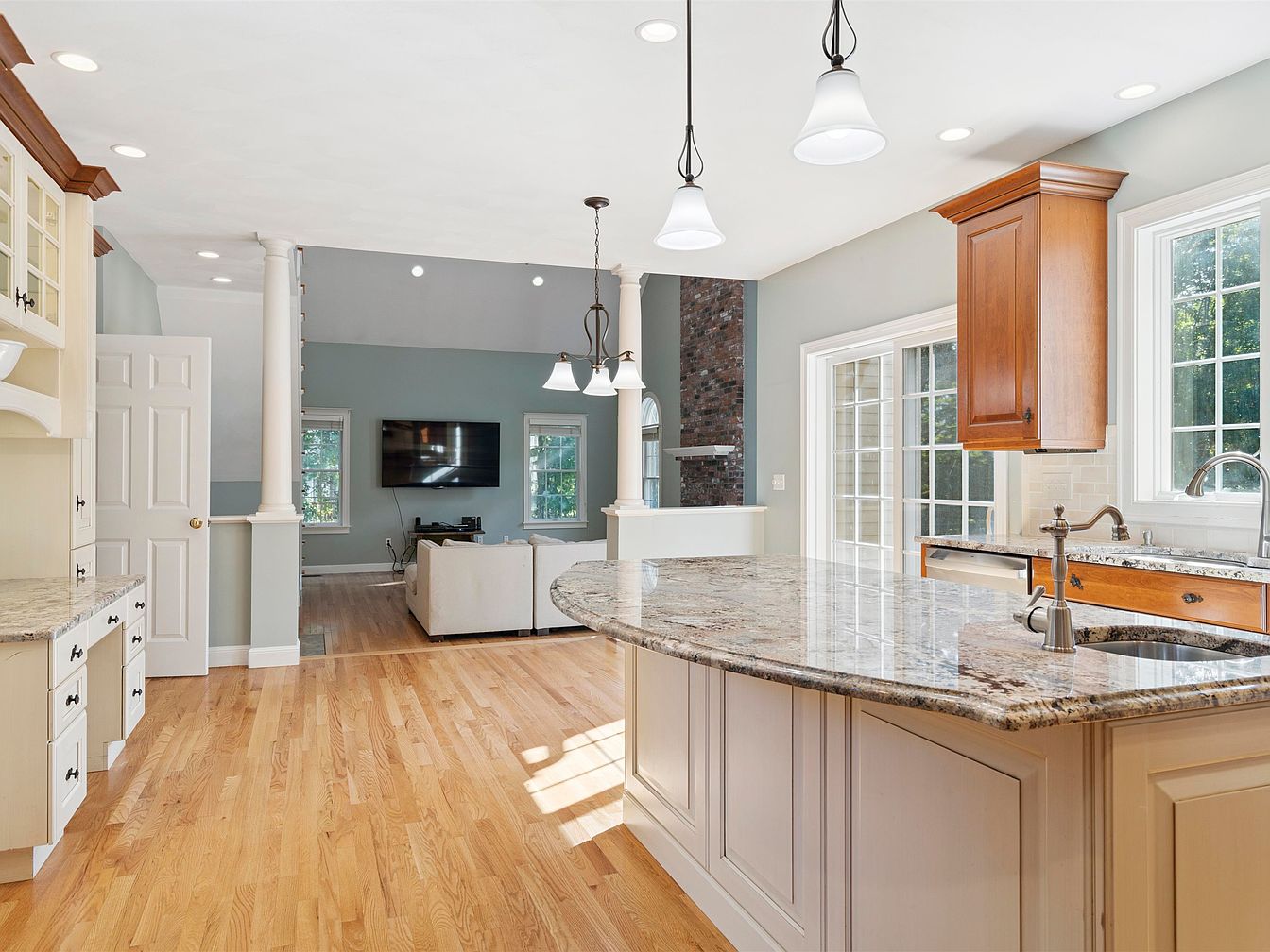 The interior showcases a spacious kitchen with a modern, open layout that connects seamlessly to an adjacent living area. Warm wooden cabinetry, featuring a rich brown finish, complements the light-colored granite countertops, enhancing the inviting atmosphere. The cabinetry includes glass accents, allowing for decorative displays. Elegant pendant lights hang above the counter, offering both functionality and style. The flooring consists of light hardwood, which reflects natural light from expansive windows, illuminating the space. Columns define areas while remaining open, creating a sense of flow. Neutral wall colors contrast beautifully with dark elements, ensuring a harmonious aesthetic.