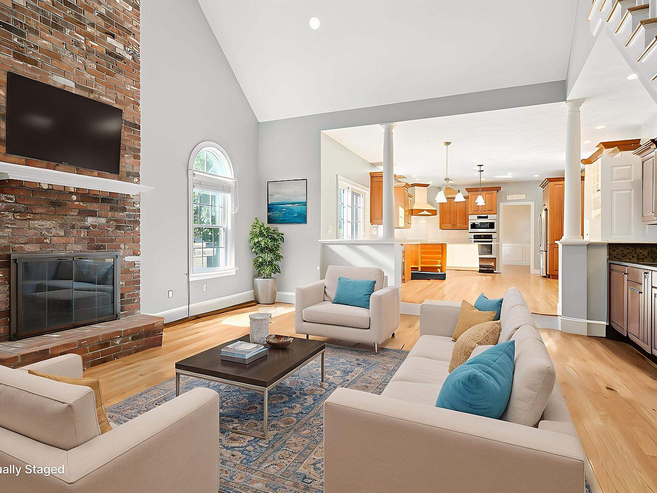 This airy living room features a vaulted ceiling with natural light flooding through large windows. The focal point is a tall brick fireplace, adorned with a sleek, modern television mounted above it. Two cream-colored sofas flank a rectangular coffee table, surrounded by decorative cushions in shades of teal and gold, enhancing the inviting atmosphere. A plush area rug with intricate patterns anchors the seating area. To one side, a vibrant green plant adds a touch of nature. Beyond, the space transitions into an open-plan kitchen, defined by warm wooden cabinetry and contemporary lighting, reinforcing a harmonious flow.