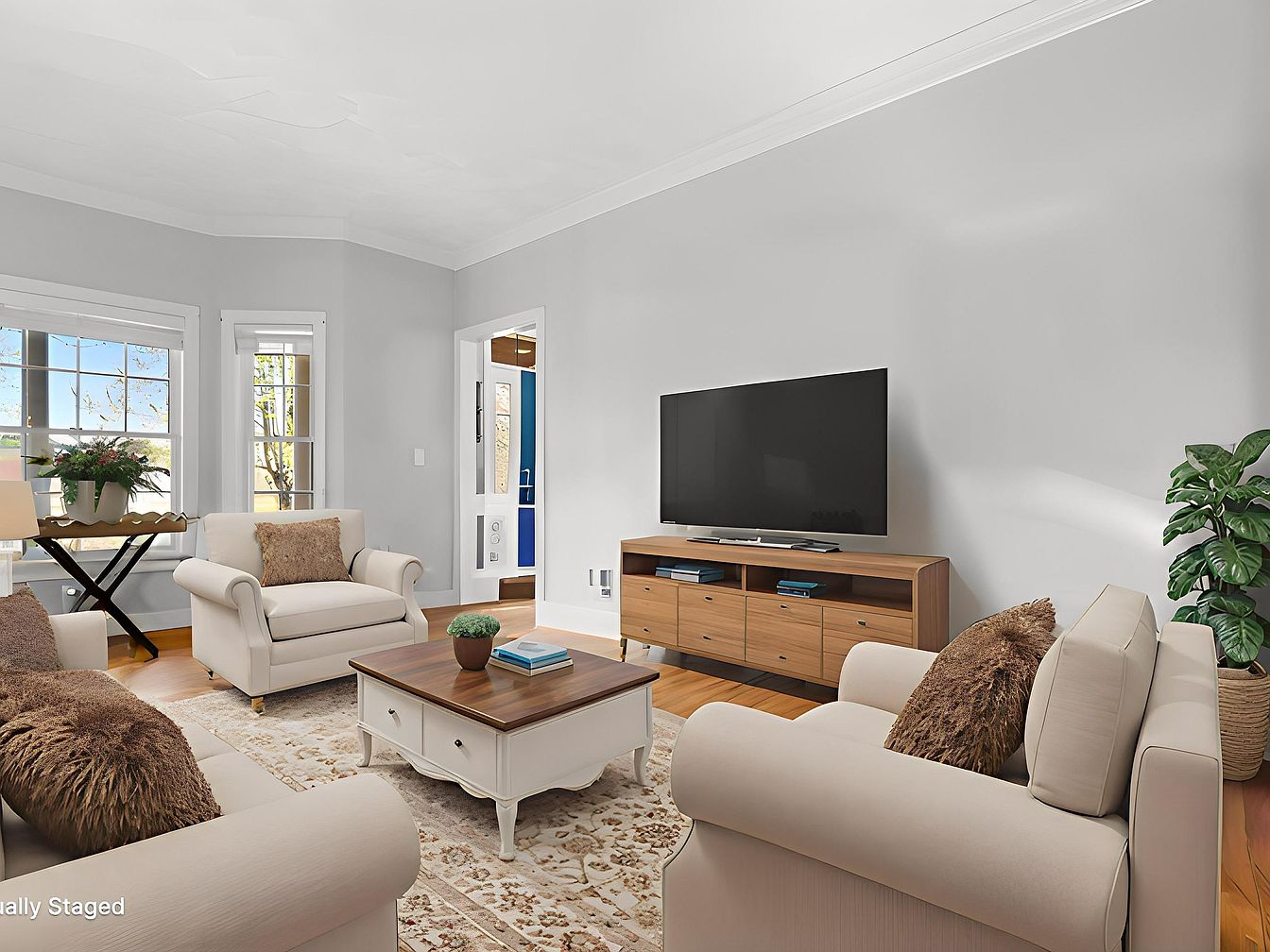 A cozy living room featuring a harmonious blend of soft neutrals and warm wood tones. Two light beige armchairs with plush brown throw pillows are positioned near a medium wooden coffee table, which holds a few books. The elegant area rug adds a touch of warmth to the polished hardwood floors. A sleek, modern TV is mounted on the wall opposite the seating, while a stylish media console below offers ample storage. Large windows allow natural light to flood the space, complemented by a small decorative table with a plant, enhancing the aesthetic with a touch of greenery.