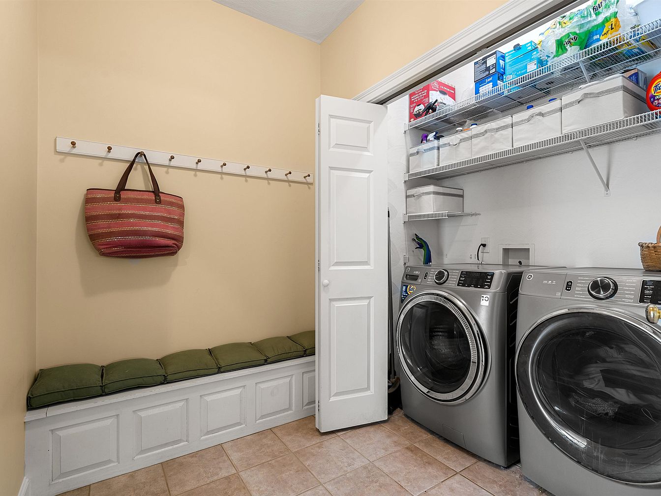 This laundry room features a practical yet cozy layout with a soothing beige color scheme that enhances the space. A padded bench runs along one wall, adorned with green cushions for comfort. Above, a white wall-mounted rack holds various supplies, displaying organized storage. To the right, sleek, modern silver washing machines provide functionality, framed by white cabinetry that reflects simplicity. Hooks on the wall serve as functional decor, displaying a stylish striped bag, adding a touch of personality. The tiled floor is both durable and aesthetically pleasing, completing the efficient design of this laundry area.