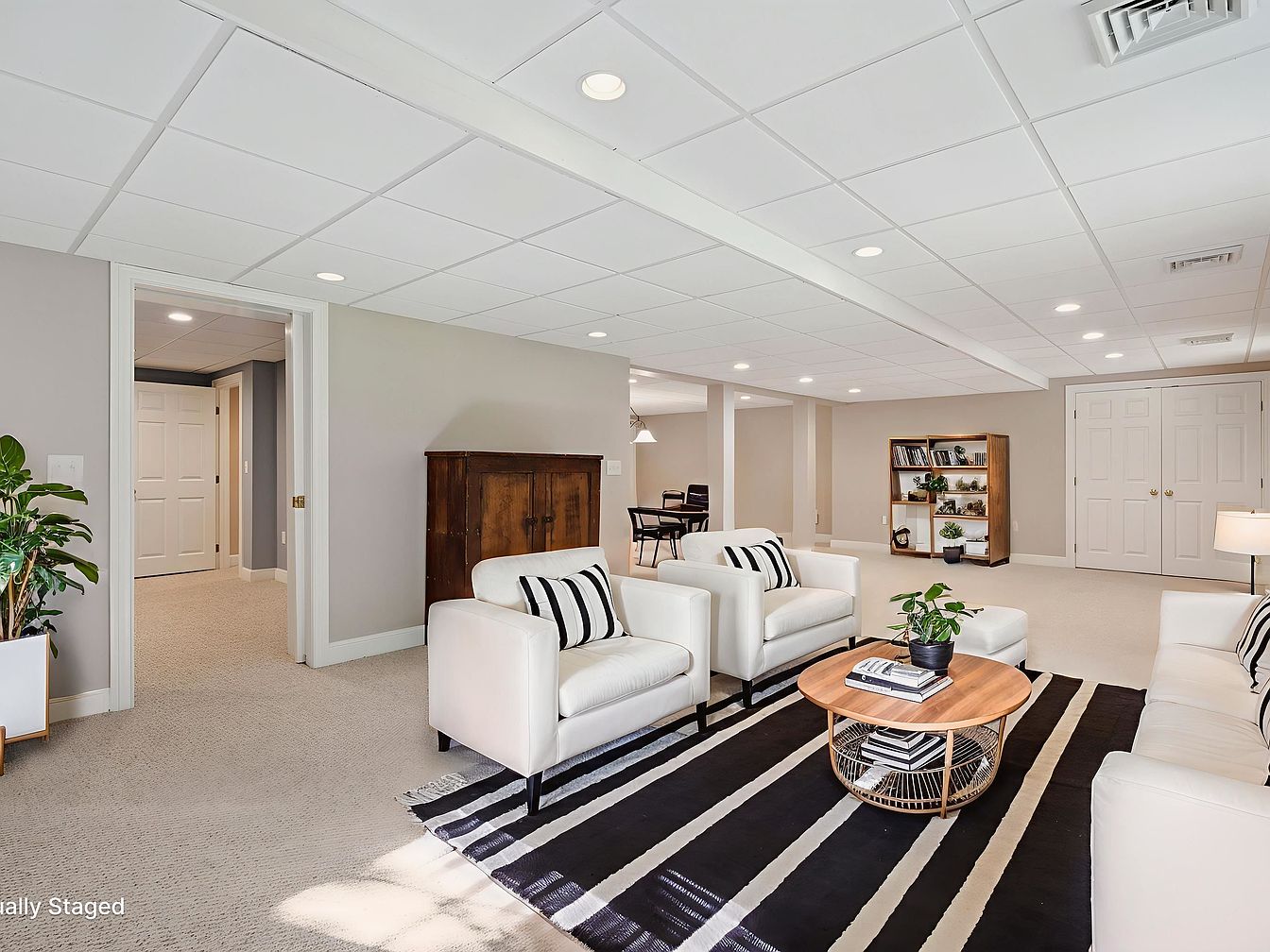 This basement lounge features a cozy layout with contemporary furniture. White, leather armchairs are adorned with black-striped throw pillows, while a round coffee table made of natural wood sits centrally on a black and white striped rug. The walls are painted in a soft gray, enhancing the room’s brightness. Recessed lighting along the ceiling adds a modern touch, while a potted plant introduces a hint of greenery. A wooden cabinet is positioned against one wall, and built-in shelving displays books and decorative items. The open space allows for smooth movement, ideal for relaxation or entertainment.