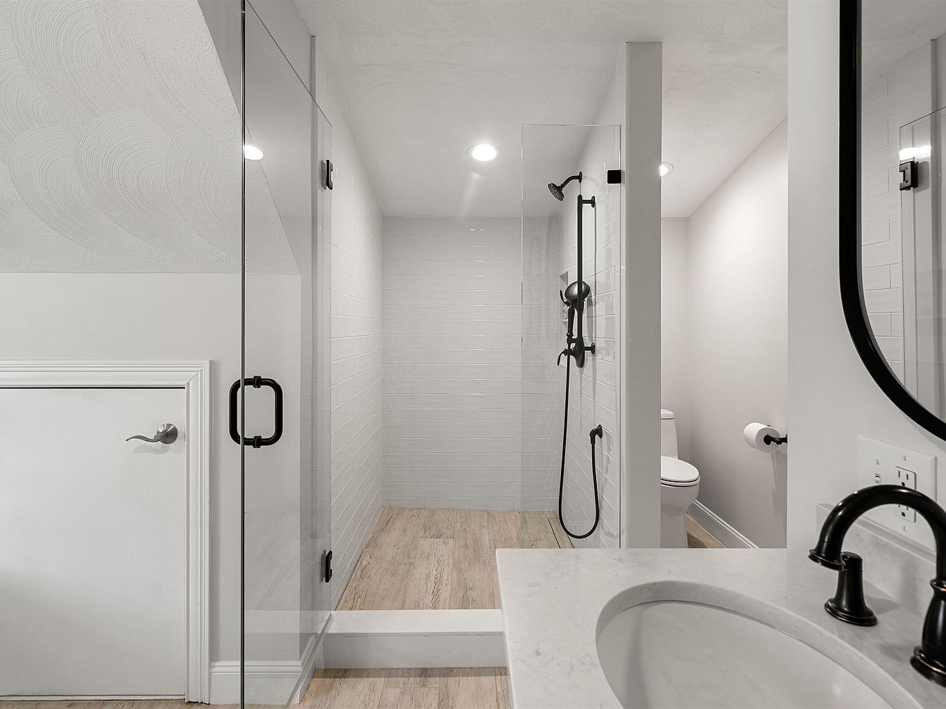 A modern bathroom layout with a spacious shower area featuring clear glass walls and a sleek black showerhead. Light gray tiles create a clean backdrop, while the warm-toned wooden flooring adds a natural element. A circular black-framed mirror above the white sink contrasts beautifully with the marble countertop. The minimalist white cabinetry includes a discreet door leading to additional storage. Subtle lighting fixtures enhance the openness, creating an inviting atmosphere. A commode is placed conveniently in the rear corner, paired with a simple toilet paper holder. Overall, the aesthetic blends functionality with contemporary style.