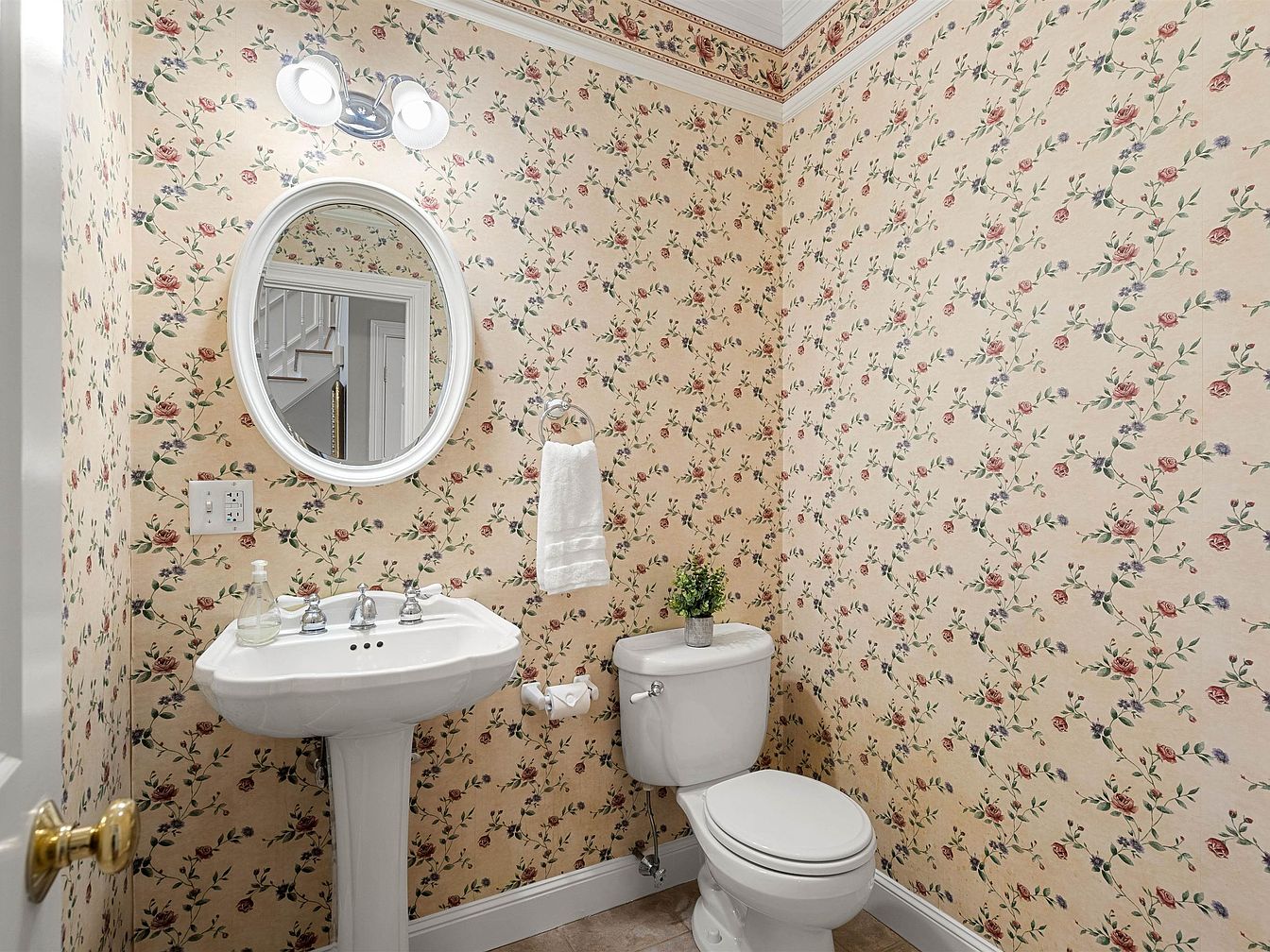 This quaint powder room features floral wallpaper in soft pastel shades, predominantly beige with delicate rose motifs in pink and blue. A round, white-framed mirror hangs above a classic pedestal sink, which shows a sleek design with three vintage-style faucet handles. To one side, a white toilet is neatly positioned, complemented by a plush white towel hanging from a wall-mounted holder. The ceiling showcases detailed crown molding, enhancing the room’s elegant finish. A small potted plant adds a touch of greenery, creating a fresh, inviting atmosphere in this charming space.