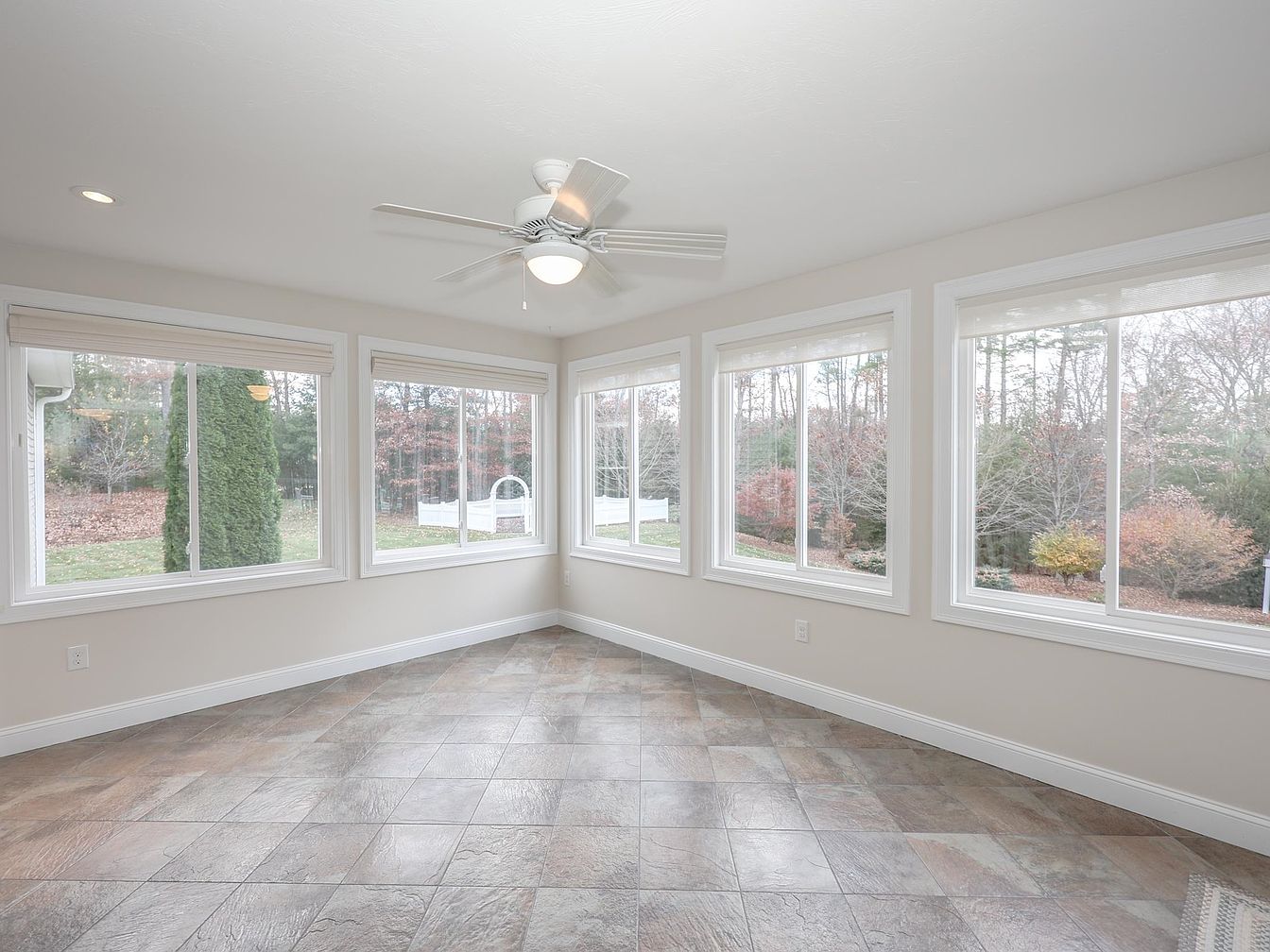 This sunroom features an abundance of natural light, created by large, panoramic windows on three sides, allowing views of the surrounding greenery. The walls are painted a soft, neutral color that complements the intricate, stone-like tile floor, adding warmth to the space. A contemporary ceiling fan hangs in the center, providing ventilation while enhancing the modern aesthetic. The room’s open layout encourages relaxation and could serve as a serene reading nook or casual gathering area. The simplicity of the furnishings, if included, would likely emphasize the tranquil atmosphere, inviting in the beauty of the outdoors.