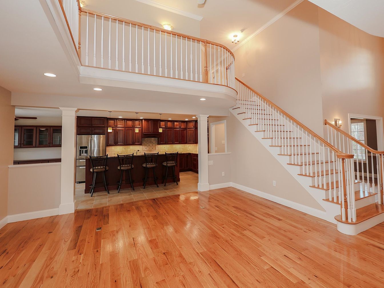 This spacious living room features warm hardwood flooring and an open layout that seamlessly connects to the kitchen. A curved staircase with elegant wooden railings ascends to a mezzanine level, enhancing the room’s height and light. Soft beige walls complement the rich mahogany cabinetry in the adjoining kitchen, which is visible through an archway. The kitchen boasts contemporary fixtures, including modern barstools at a dark countertop. Recessed lighting and strategically placed sconces create a welcoming ambiance, while large windows allow natural light to flood the space, accentuating the inviting atmosphere.