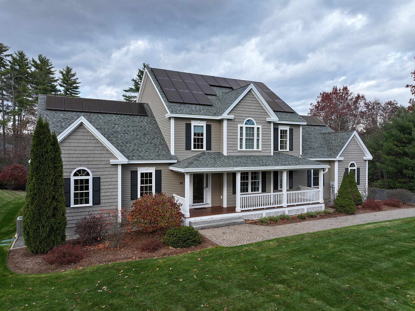 The exterior of the house features a charming, traditional design with a combination of light gray shingles and contrasting darker trim. The sloped roof is adorned with solar panels, showcasing modern sustainability. A welcoming porch supported by white columns invites relaxation, while the intricate balustrade adds a classic touch. Large, arched windows with black shutters enhance the facade, allowing ample natural light. The landscaped yard features manicured greenery, complemented by autumnal shrubbery, adding color contrast. A cobblestone pathway seamlessly leads to the entrance, emphasizing the home’s inviting character amid a serene backdrop of trees.