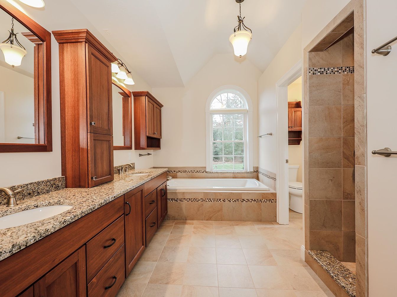 This spacious bathroom features a harmonious blend of functionality and elegance. Dark wood cabinets provide ample storage and counter space, complemented by a richly veined granite countertop. A pair of undermount sinks sit beneath two wall-mounted mirrors, creating a symmetrical layout. The floor showcases large, neutral-toned tiles that enhance the room’s airy feel. A luxurious soaking tub is nestled beneath an arched window, allowing natural light to flood in, while a glass-enclosed shower adds modern convenience. Soft lighting fixtures hang from the vaulted ceiling, contributing to the inviting ambiance of the space.