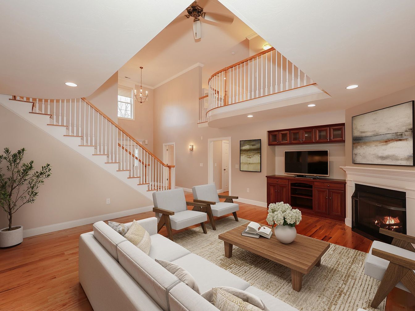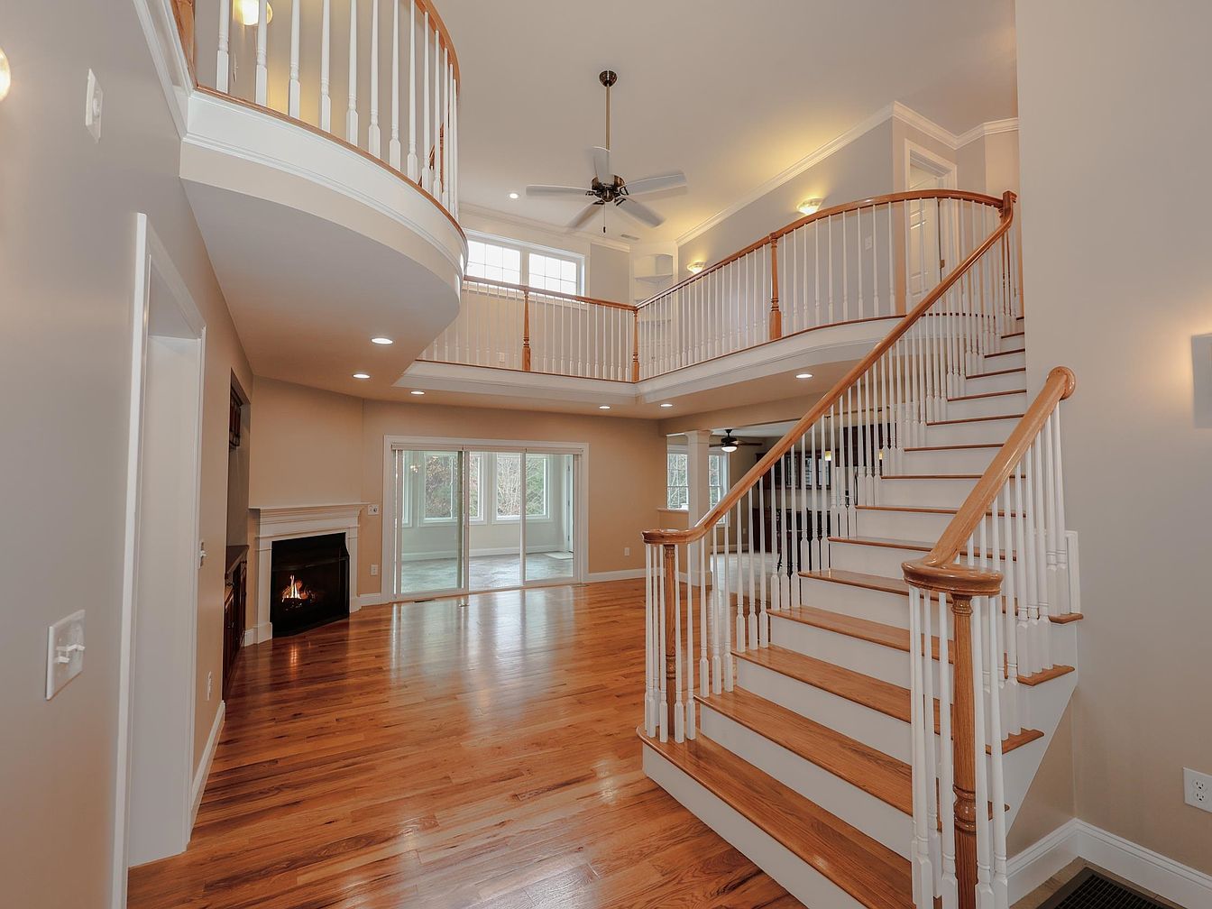A spacious entryway features a grand staircase with wooden steps and white spindles, creating an inviting focal point. To the right, a cozy fireplace adds warmth, complemented by elegant wood flooring that enhances the rich tones throughout the space. The walls are painted in soft neutral colors, contributing to a calm, airy atmosphere. Large windows allow natural light to flood in, while recessed lighting offers additional illumination. The curved balcony above adds architectural interest and elegance. This transitional space seamlessly connects to the living area, promoting flow and accessibility, ideal for welcoming guests.