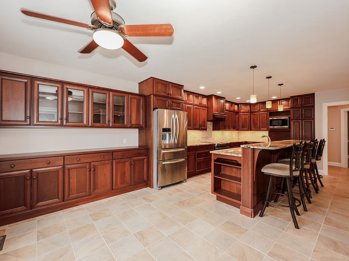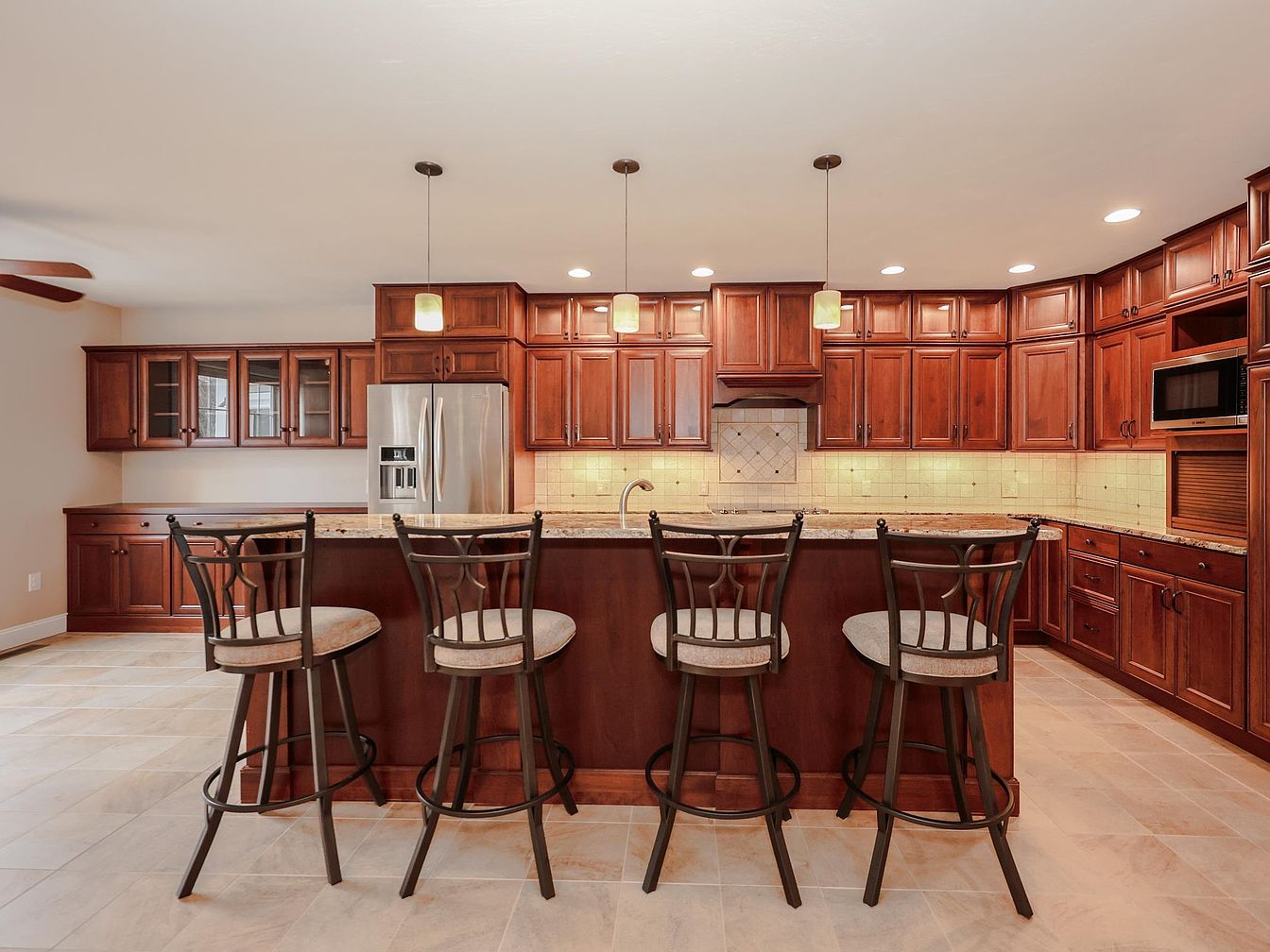 A spacious kitchen featuring rich, mahogany cabinetry that spans the room, providing ample storage and a warm atmosphere. The countertop is a light granite, complemented by a backsplash of small, light-colored tiles that enhance the brightness. Sleek stainless steel appliances, including a refrigerator and an embedded microwave, offer modern convenience. A large island with bar seating showcases four black metal barstools with cushioned seats, inviting casual dining. Pendant lighting with a soft glow hangs above the island, adding a contemporary touch. The floor is tiled with large, light-colored stones, balancing the darker cabinetry, creating an inviting space.