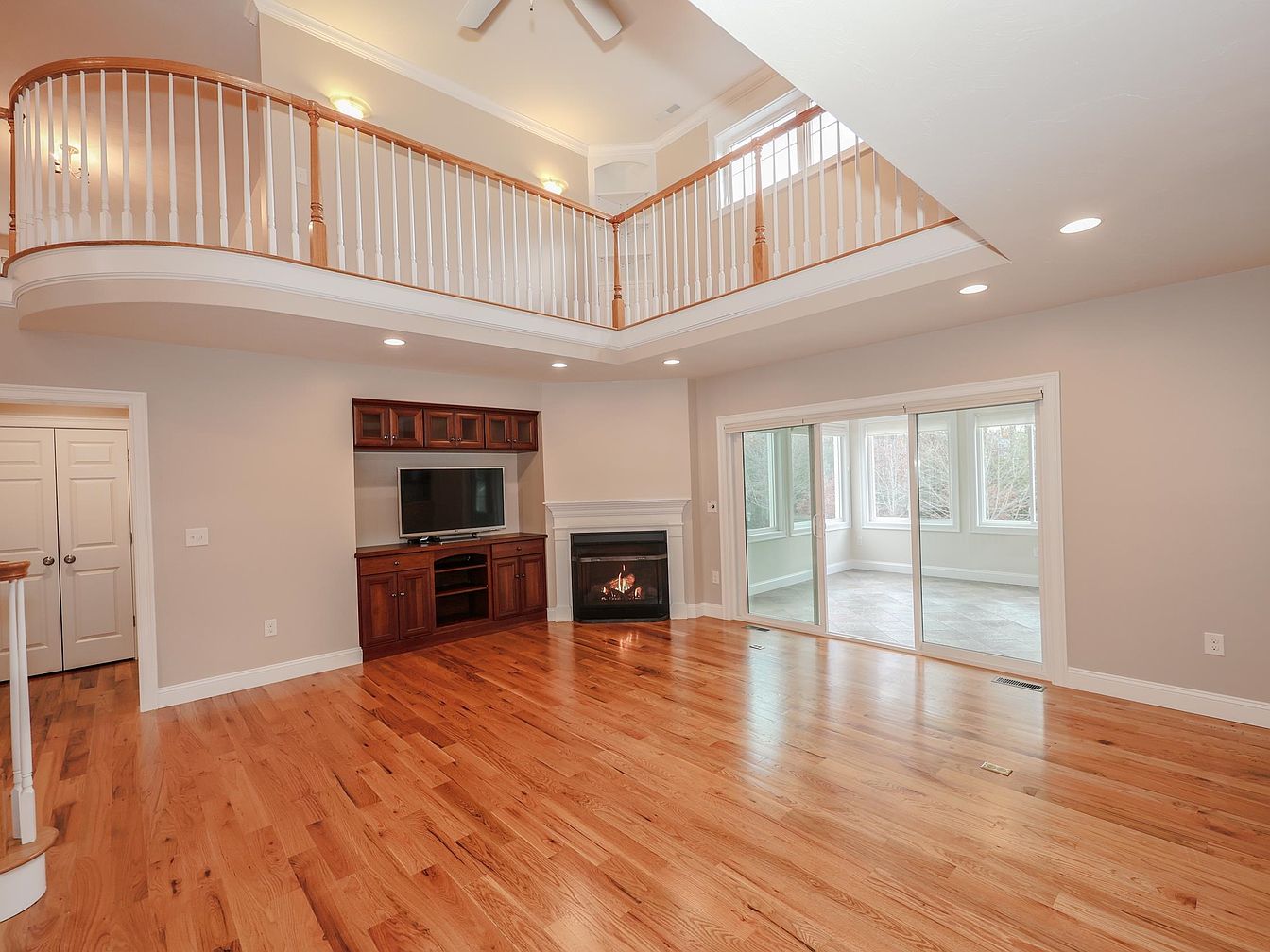 This open-concept living room features a blend of modern and classic aesthetics. Walls are painted in a soft gray, complementing the rich tones of the hardwood flooring. The focal point is a cozy fireplace, framed by a white mantel, creating a warm atmosphere. A sleek entertainment unit sits below a mounted television, maximizing space. The room is illuminated by recessed lighting and natural light streaming through expansive sliding glass doors, leading to a sunroom. Elegant railings lead to an upper level, enhancing the room’s verticality. Overall, it exudes a welcoming and airy ambiance, perfect for relaxation.