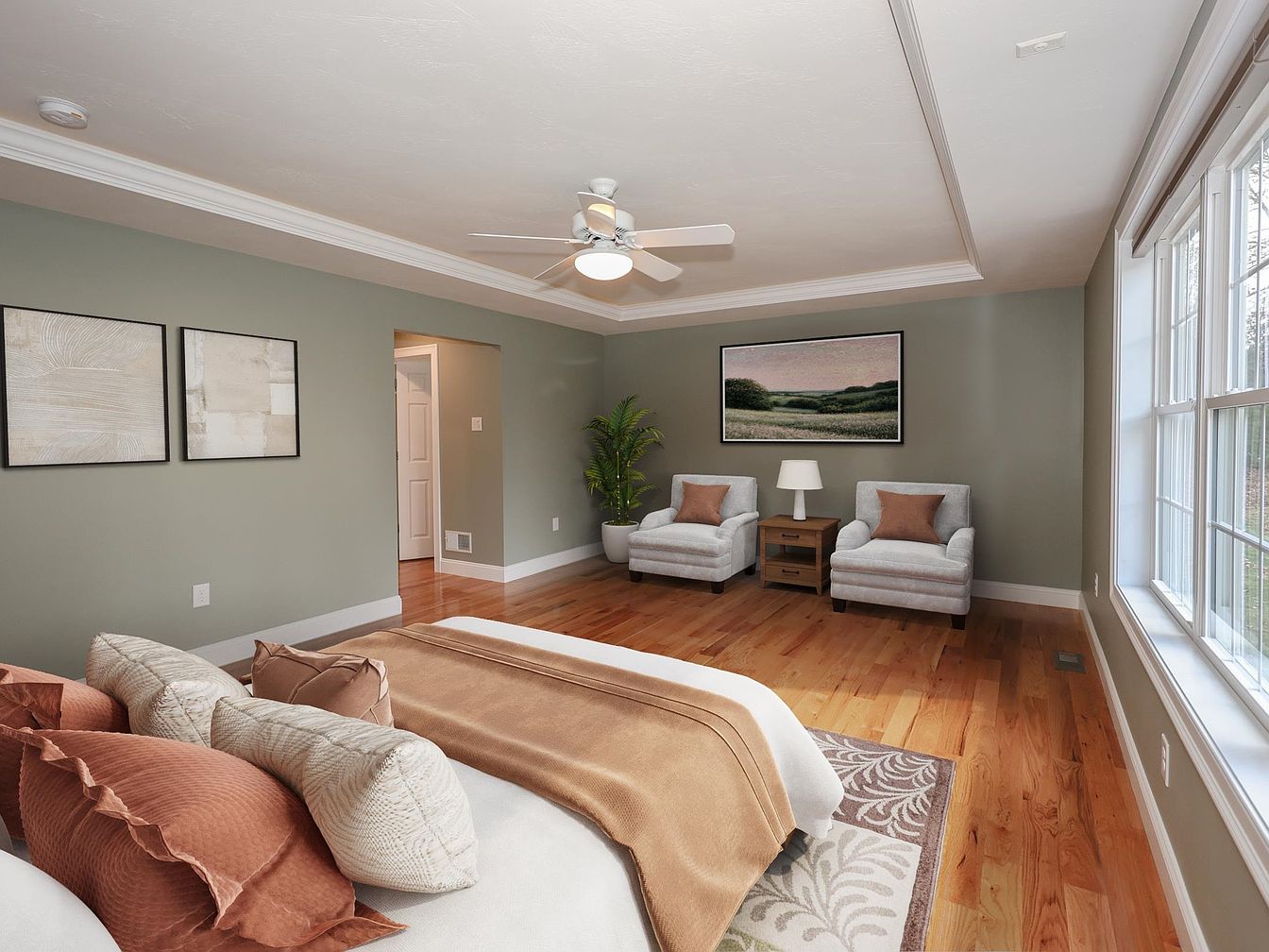 A spacious bedroom showcasing a calming green palette, complemented by warm wooden flooring. The focal point is a luxurious bed adorned with textured pillows in rust and cream hues, paired with a soft throw. Two cozy armchairs sit opposite the bed, each with coordinating cushions, beside a wooden nightstand lit by a stylish lamp. Artwork featuring serene landscapes adorns the walls, enhancing the tranquil atmosphere. The crown molding adds elegance, while large windows invite natural light, creating a bright, airy feel, perfect for relaxation and comfort in this serene retreat.