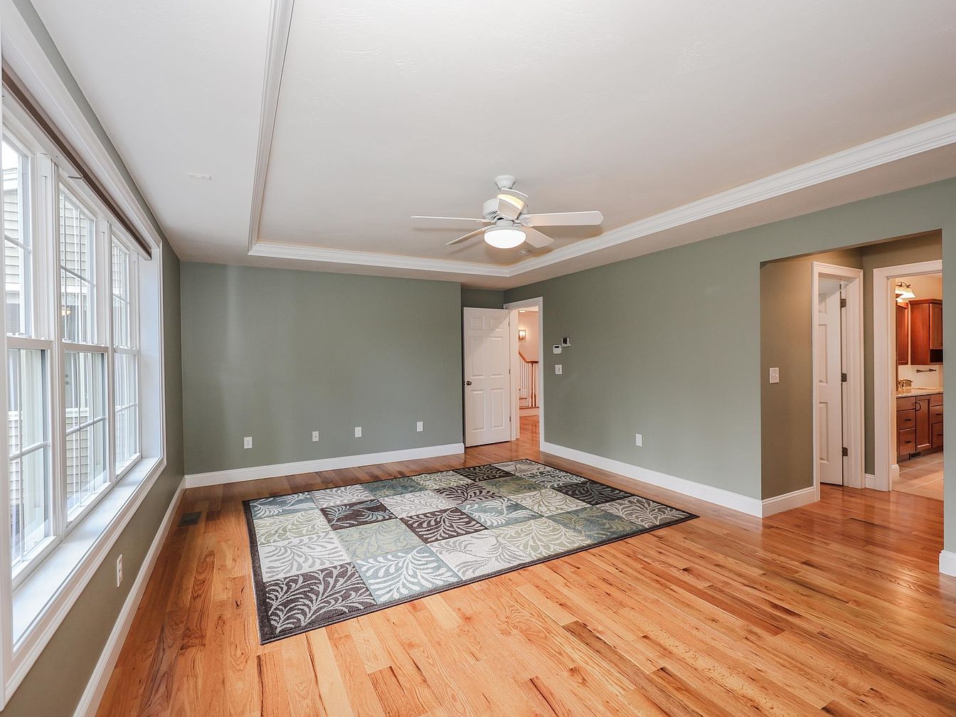 A spacious living room features a muted green wall color accentuated by white crown molding and baseboards. Large windows invite ample natural light, highlighting the rich, polished hardwood floors that add warmth to the space. The room is anchored by a patterned area rug with geometric shapes in earthy tones and soft blues. A contemporary ceiling fan hangs centrally, providing comfort while maintaining a modern aesthetic. Two doorways lead to adjacent spaces, offering seamless flow throughout the home. Overall, the design combines traditional elements with a fresh, inviting atmosphere that encourages relaxation.