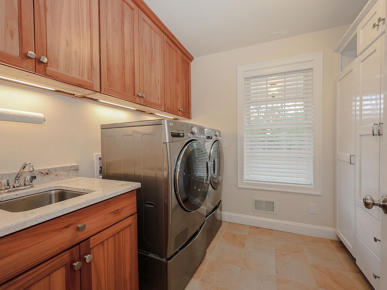 This cozy laundry room features a functional layout with modern appliances. Stainless steel washing and drying machines are seamlessly integrated alongside a granite countertop, ideal for folding clothes. Above, wooden cabinets with a warm finish provide ample storage. The color scheme combines light beige walls with soft earth tones in the cabinetry, enhancing the inviting atmosphere. A window with blinds allows natural light to filter in, brightening the space. The tiled flooring is designed for durability and complements the warm cabinetry. Each detail contributes to a practical yet aesthetically pleasing environment, reflecting efficient home functionality.