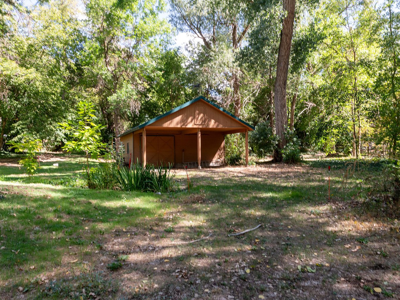 A cozy garden shed nestled among lush greenery. The structure features a warm, natural wood façade with a slight incline on the roof, topped with a calming blue trim. Surrounded by tall trees and vibrant underbrush, the shed complements the landscape with its organic color palette. In front, small patches of grass and wildflowers thrive, enhancing the tranquil atmosphere. The large double doors are slightly ajar, suggesting it’s well-used for garden supplies. Sunlight filters through the trees, casting playful shadows on the ground, creating an inviting and serene outdoor retreat.
