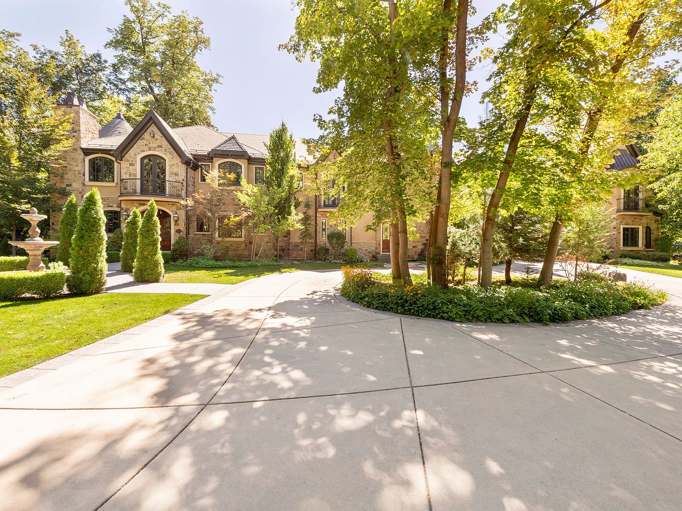 The image shows a stately exterior of a historic American home, surrounded by lush greenery. The house features a blend of stone and stucco, with a charming steep roofline and intricate architectural details. Large arched windows invite natural light and offer a glimpse of the beautiful interior. A circular driveway leads to the entrance, bordered by manicured lawns. Tall, slender trees and neatly trimmed hedges provide a verdant backdrop, while colorful flowerbeds add vibrant splashes of color. A stone fountain rests near the front, enhancing the aesthetics and offering a serene, inviting atmosphere.