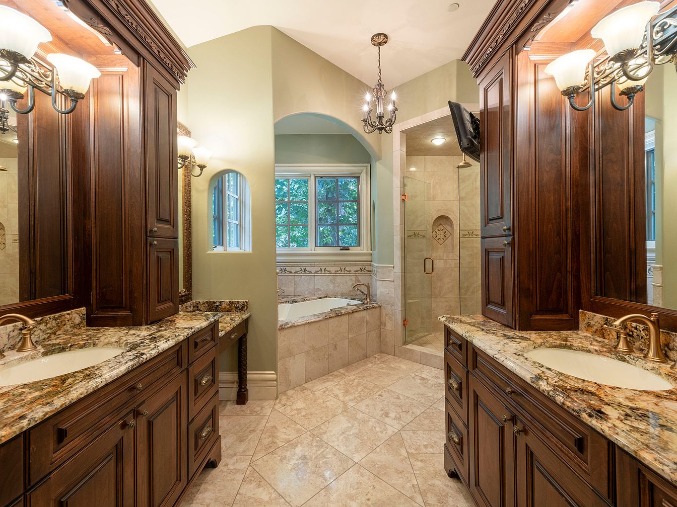 This spacious master bathroom features elegant design elements, highlighted by rich wooden cabinetry and luxurious granite countertops. The dual vanities are equipped with polished faucets, complementing the intricate details of the cabinetry. Soft green walls create a serene atmosphere, while stunning tile work adds sophistication. A well-placed chandelier illuminates the room, enhancing its grandeur. The glass-enclosed shower reflects modern design with its seamless appearance, while an inviting soaking tub sits beside a large window that frames a view of nature. The combination of textures and finishes creates a cohesive, upscale look that invites relaxation.