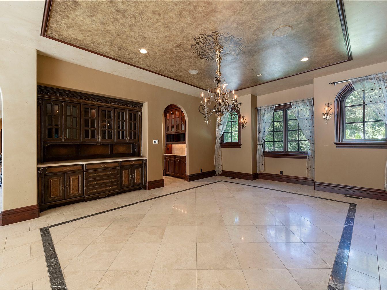 This elegant dining area features a spacious layout with creamy marble flooring accented by dark marble inlays, creating a striking contrast. The walls are adorned in warm beige tones, complemented by rich wooden trim that adds sophistication. A dark wooden sideboard with glass-paneled doors provides storage and display space, while a stunning chandelier hangs from the intricately designed ceiling, enhancing the room’s grandeur. Large arched windows draped with sheer curtains allow soft light to filter in, casting a gentle glow across the space. Decorative wall sconces further illuminate the area, adding a touch of intimacy.