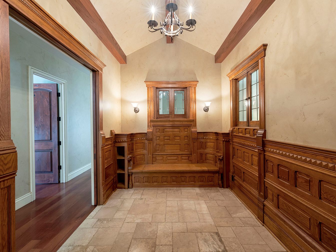 This entryway features a grand, vaulted ceiling with rich wood beams, showcasing a warm, inviting atmosphere. The walls are adorned with intricate wood paneling, contrasting beautifully with a soft, neutral plaster finish. A built-in wooden bench, complete with decorative carvings, offers a place for guests to sit. The floor is covered in light-colored stone tiles, enhancing the spacious feel. A charming chandelier, accompanied by wall sconces, illuminates the space, highlighting the craftsmanship of the woodwork. To the left, a doorway leads to another room, while windows allow natural light to filter in, creating a well-lit entry.