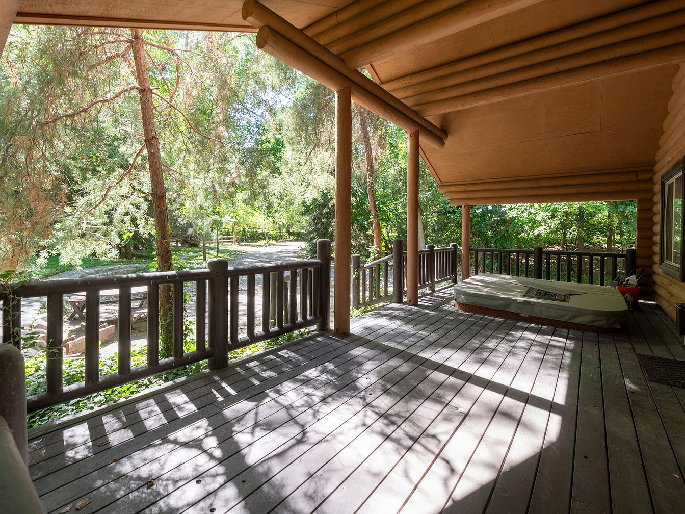 The outdoor patio features a rustic wooden design with log pillars supporting the roof, creating a warm, inviting atmosphere. A smooth, dark wooden floor extends across the space, accentuated by soft, dappled sunlight filtering through the surrounding trees. There’s a simple mattress laid on the ground, hinting at relaxation and comfort. The railing, made of thick logs, provides safety while enhancing the natural aesthetic. Lush greenery surrounds the patio, with trees and plants adding vibrant shades of green, contributing to a serene ambiance that encourages tranquility and leisure in a natural setting.