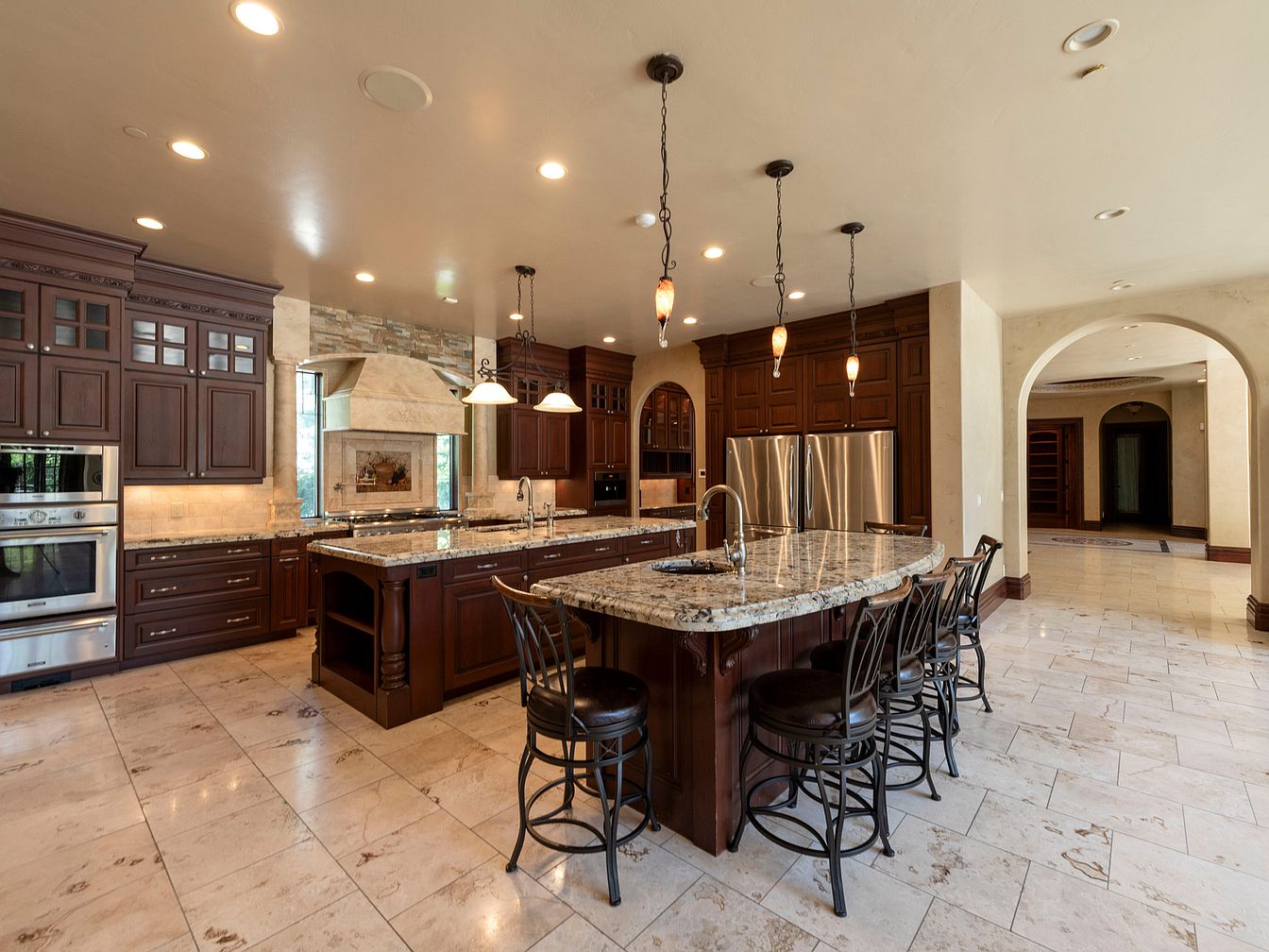 Spacious kitchen featuring rich dark wood cabinetry complemented by a beautiful granite countertop. A large island serves as the centerpiece, with comfortable bar stools arranged around it. Elegant pendant lights hang above, adding a warm glow. Contemporary appliances including a stainless steel oven and refrigerator are seamlessly integrated, enhancing functionality. Large windows invite natural light, highlighting the intricate stone backsplash behind the stove. The flooring is laid with polished marble tiles, creating a luxurious feel. Architectural arches lead to adjacent spaces, suggesting an open layout that blends style and convenience effortlessly.