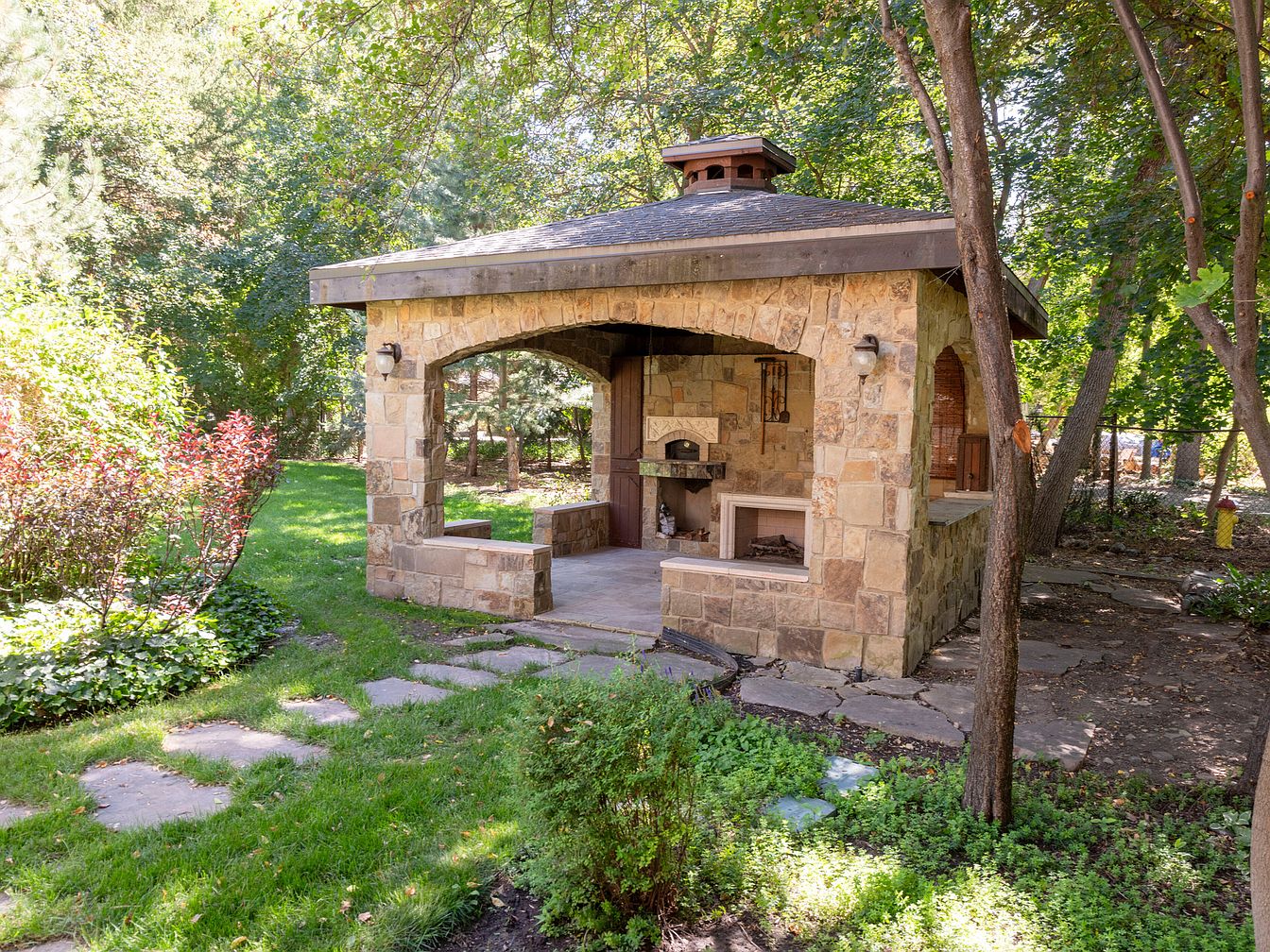 A charming outdoor pavilion featuring a rustic stone structure with an arched entrance, enhanced by dual support columns. The earthy tones of the natural stone blend seamlessly with the vibrant green of the surrounding landscape. Inside, there is an area for grilling or cooking, accentuated by elegant stonework, while a cozy seating nook waits in a sheltered corner. Lush greenery and flowering shrubs frame the pavilion, creating a serene atmosphere. The sloped roof adorned with a cupola adds architectural interest, harmonizing with the natural setting and inviting outdoor gatherings or relaxation.