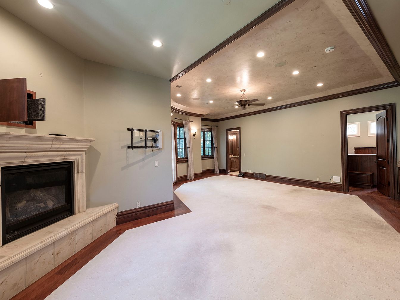 Spacious living room with a cozy ambiance, featuring neutral green walls and rich wood accents. A modern marble fireplace serves as a focal point, complemented by elegant recessed lighting and a subtle ceiling design. The hardwood floors add warmth, contrasting the plush beige carpet. A large window allows natural light to flood the space, enhancing its inviting feel. The room flows into adjacent areas without barriers, providing a sense of openness. Dark wooden trim outlines the windows and doors, while a ceiling fan adds functional style. Architectural details blend contemporary and classic elements harmoniously.