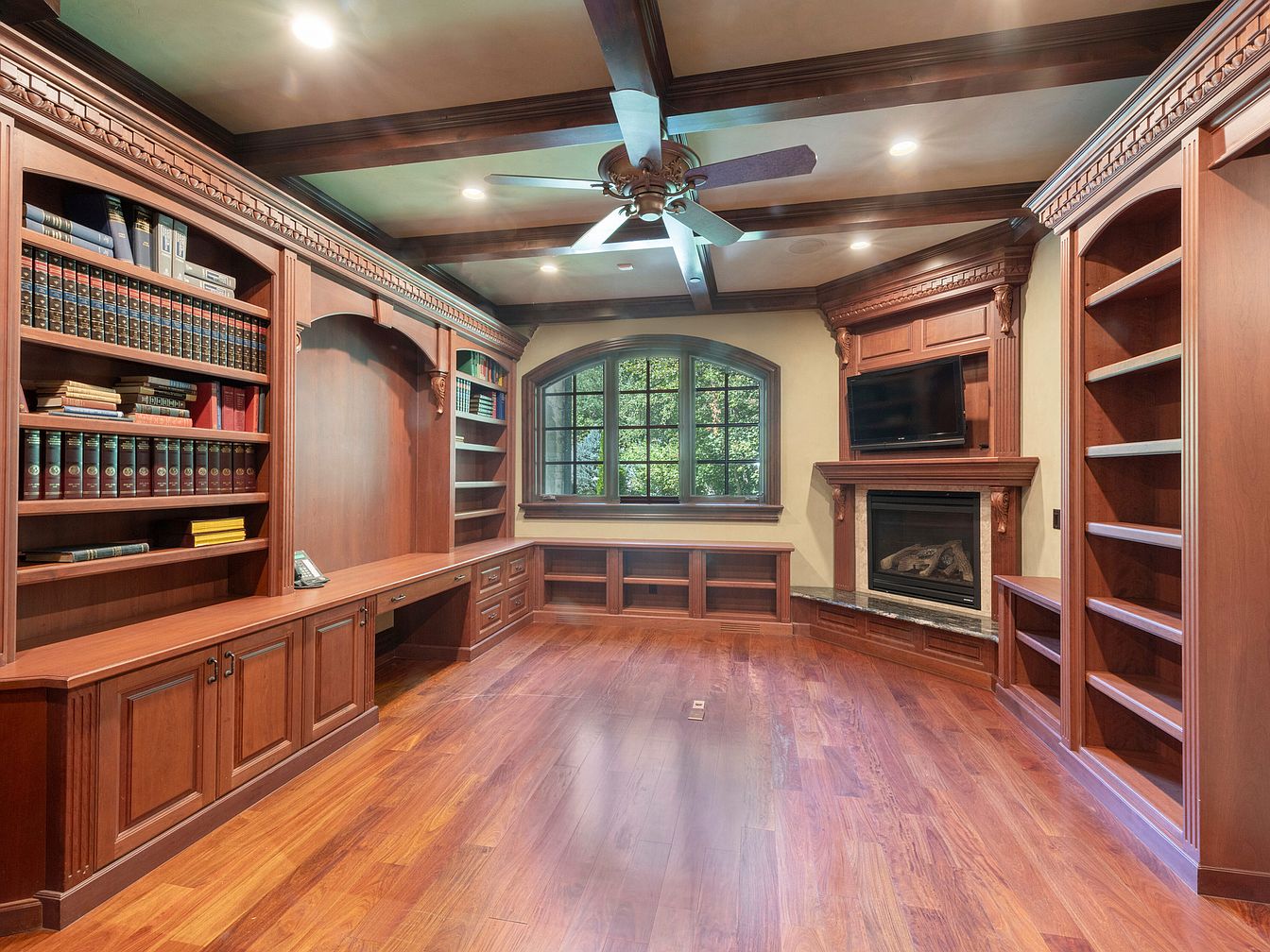 This elegant home office features rich, dark wood cabinetry that creates a warm and inviting atmosphere. The built-in shelves are filled with books, showcasing a classic and intellectual vibe. A sophisticated corner fireplace adds a cozy focal point, while a flat-screen TV is mounted above it for modern convenience. The ceiling boasts intricate wooden beams, enhancing the timeless design. Large, arching windows allow natural light to flood the space, with views of the surrounding greenery. The polished hardwood floor complements the overall warm color scheme, reflecting luxury and sophistication in this meticulously designed workspace.