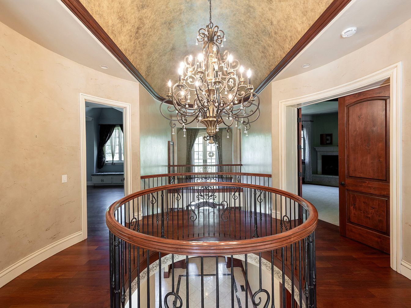 This upper hallway features a graceful circular layout, highlighted by a luxurious chandelier that hangs from a textured ceiling, creating an air of elegance. The walls boast a soft, muted color palette, enhancing the serene atmosphere. Rich wooden railings encircle the space, complemented by intricate wrought iron balusters below, providing both safety and style. The rich hardwood flooring contrasts against the polished marble inlaid section, contributing warmth. Doorways lead to adjacent rooms, with one framed by a striking dark wood door, inviting the elegance within. Overall, the area exudes sophistication and timeless charm.