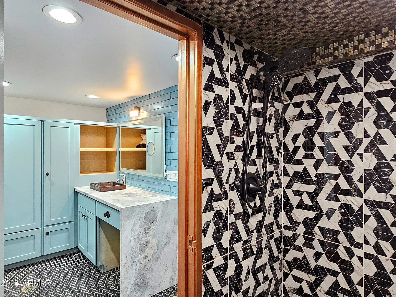 The bathroom features a unique blend of textures and colors. The walls are adorned with an eye-catching black and white geometric tile pattern, providing a modern contrast against the soothing light blue cabinetry. A marble countertop complements the cabinetry, while a rectangular wooden tray sits atop, adding warmth to the aesthetic. Loose shelving is integrated beside a round mirror, enhancing functionality and style. Overhead lighting ensures brightness, and a sleek black shower fixture stands out against the intricate tile. The hexagonal black floor tiles complete the space, contributing to a cohesive contemporary design.