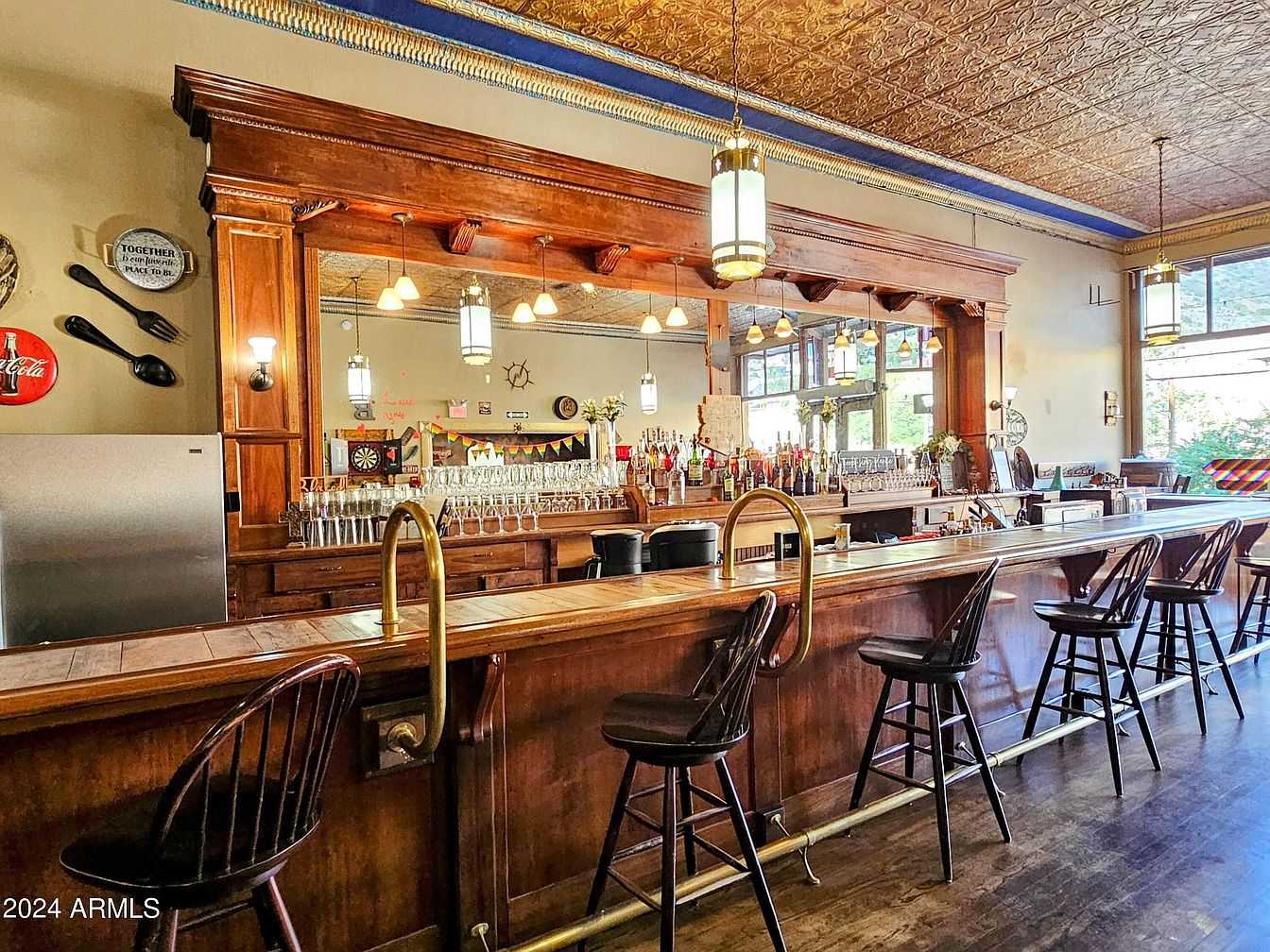 A rustic bar area features rich wooden finishes with a polished countertop and high-backed wooden stools. The bar is anchored by an impressive wooden structure, adorned with brass fixtures that provide warm lighting. Above, a beautifully detailed tin ceiling adds character and elegance, complemented by the vibrant blue trim. Various spirits and glasses are neatly arranged on the shelves behind the bar, creating a lively atmosphere. Decorative elements including vintage signs and playful accents enhance the charming vibe, while large windows allow natural light to filter in, illuminating the inviting space perfectly.