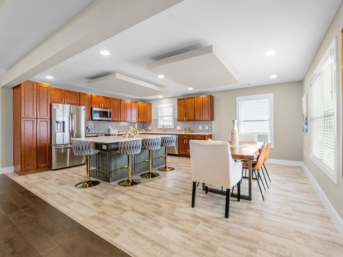 An open-concept kitchen and dining area features warm wood cabinetry paired with a stainless steel refrigerator and modern appliances. The kitchen island is topped with a light stone countertop and surrounded by four tufted, gray upholstered stools with gold bases. Mosaic tile backsplash adds subtle texture above the counters, while recessed ceiling lights keep the space bright. The dining area holds a wooden table with tan leather chairs and two white armchairs at each end, positioned near large windows that offer plenty of natural light. Pale wood flooring and soft beige walls create an inviting, contemporary atmosphere.