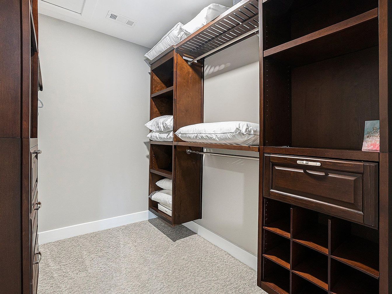 A spacious walk-in closet features dark wooden built-in shelving and storage units on both sides, creating a warm, elegant atmosphere. The shelves and cubbies offer plentiful storage with open sections, some holding neatly folded spare pillows and linens. A hanging rod is integrated for clothing. The carpeted floor in a neutral beige color adds softness, while the walls are painted a light, muted gray, contributing to a bright, clean feel. The ceiling is flat and white with a recessed attic door and air vent. The room feels organized, practical, and thoughtfully designed for efficiency and order.