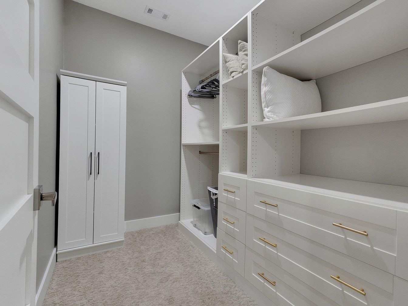 A well-organized walk-in closet features white built-in cabinetry along one wall, incorporating multiple open shelves, drawers with gold handles, and a dedicated section for hanging clothes. A freestanding white wardrobe with simple black handles stands against the far wall, providing additional storage. The soft beige carpet flooring adds warmth and comfort, contrasting with the light gray painted walls. The space is brightly lit by recessed ceiling lights, and the overall aesthetic emphasizes a clean, modern look with minimalist finishes, ample storage, and neatly arranged accessories such as pillows and baskets, creating an uncluttered, functional feel.