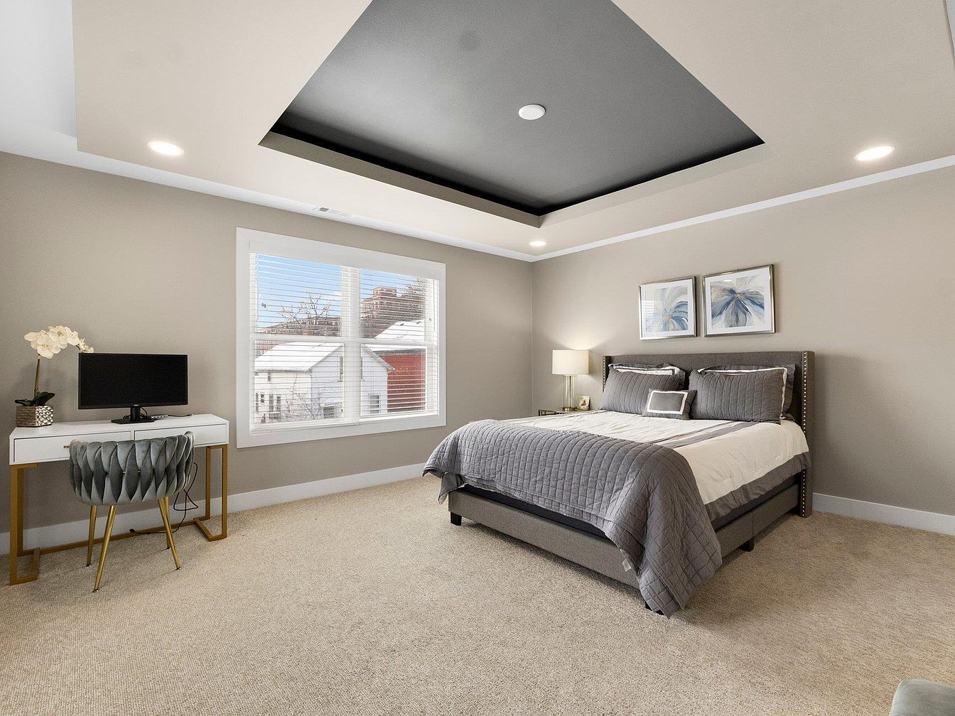 A spacious bedroom with soft beige carpeting and warm, neutral walls. Central to the room is a queen bed with a studded grey headboard and neatly arranged grey and white bedding. Above the bed, two abstract blue and white artworks lend a subtle pop of color. To the right, a modern nightstand holds a lamp with a cream shade, while on the left side, a sleek white desk paired with a velvet, pleated chair sits under a large, bright window. The coffered ceiling features a dramatic charcoal-grey recessed center and recessed lighting, providing a contemporary touch to the classic, serene ambiance.