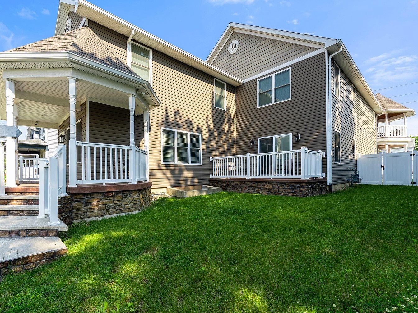 A spacious backyard features a well-maintained stretch of green lawn bordered by a modern two-story house with taupe siding and crisp white trim. The house has a charming wraparound porch accented by white railings, classic columns, and a foundation of stacked stone. A wide set of stone steps leads up to the covered porch area, which offers shade and a view of the yard. To the right, a large open deck with matching white railing provides additional outdoor living space. The entire area is enclosed by a tall white privacy fence, contributing to a clean, inviting aesthetic.