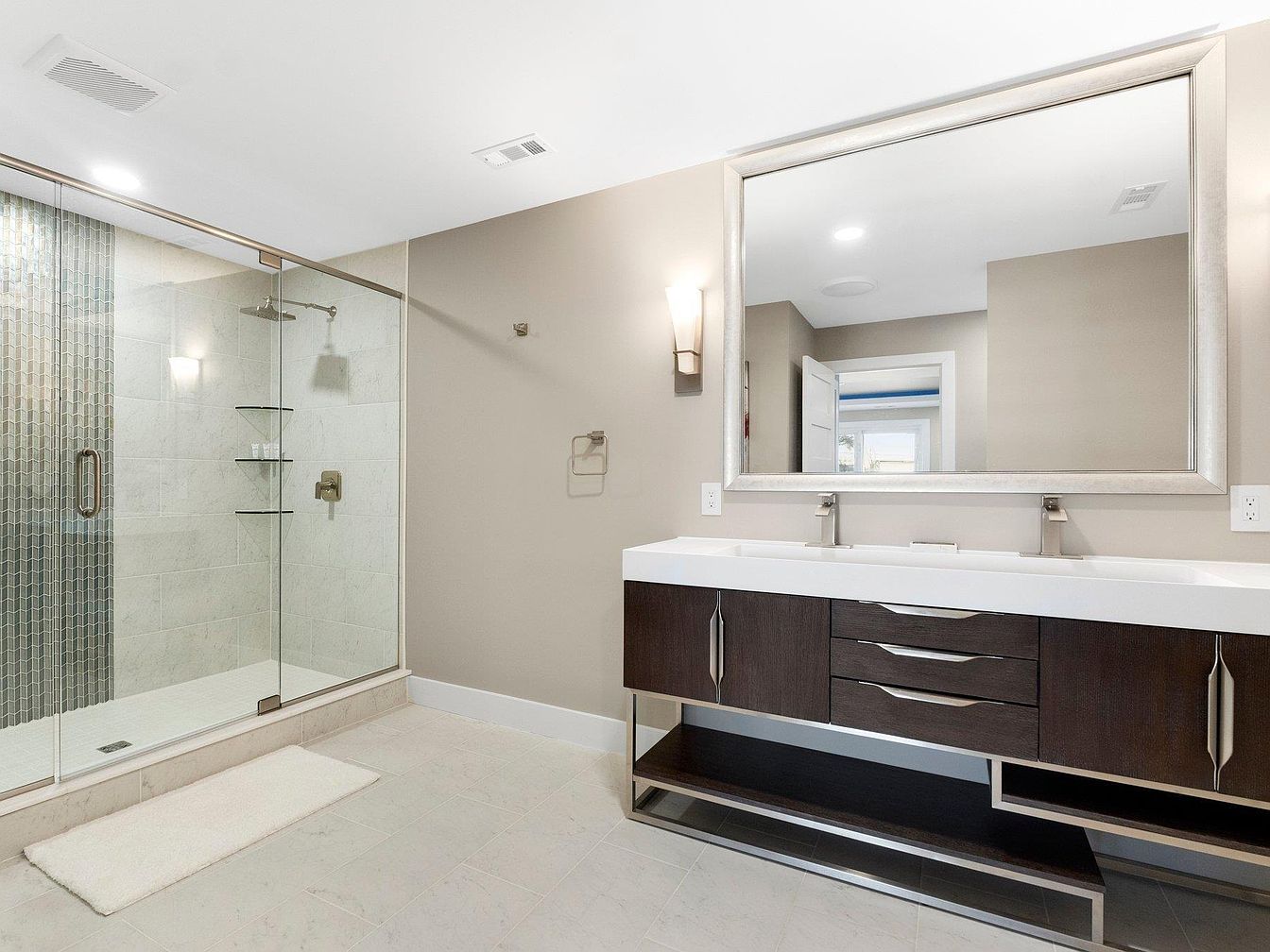 Spacious modern bathroom featuring a large double vanity with sleek dark wood cabinetry and an elongated white countertop with two sinks. Above the vanity, a wide, silver-framed mirror extends across the wall, flanked by contemporary wall sconces for ambient lighting. To the left is a sizeable glass-enclosed walk-in shower with beige tile and a vertical strip of mosaic accents. The shower includes built-in glass shelves and brushed nickel fixtures. Soft taupe walls and large light gray floor tiles add warmth and brightness. A plush white bath mat sits at the entrance to the shower, completing the pristine, airy atmosphere.