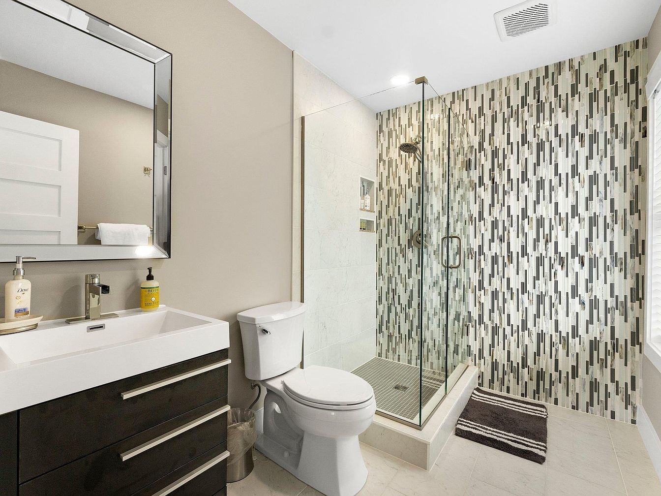 A sleek and contemporary bathroom features a glass-enclosed shower with an eye-catching accent wall of vertical, multicolored mosaic tiles in shades of gray, white, and black. The shower has a rainfall-style showerhead and a small built-in niche. The vanity is dark wood with minimalist drawers and a white rectangular basin, topped with a square, chrome-framed mirror. Neutral taupe walls and light gray tile flooring create a calm, airy atmosphere. A white toilet sits between the vanity and shower, while a striped dark gray bath mat adds a touch of contrast beside the shower entry.