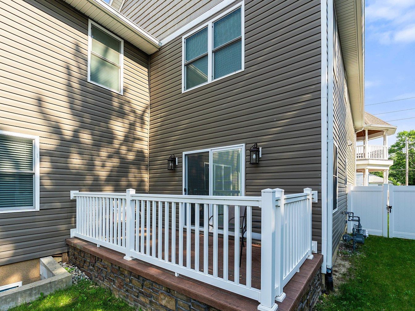 A small, raised patio sits adjacent to the house, surrounded by a bright white railing with vertical slats and sturdy posts. The patio floor appears to be made of brown composite decking, giving a warm, welcoming look. Beneath the patio, a stonework base adds texture and a touch of rustic appeal. The siding of the house is a muted taupe color, contrasted by crisp white trim around the windows and roofline. A sliding glass door, flanked by black lantern-style wall sconces, allows access from inside. Neatly maintained grass borders the patio, and a tall white privacy fence completes the enclosed backyard.