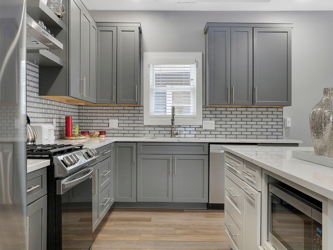 A modern kitchen features sleek, shaker-style gray cabinetry forming a U-shape around the workspace. The cabinetry is complemented by contemporary stainless steel hardware and white quartz countertops. A subway tile backsplash with gray grout adds texture and a clean look. The space is anchored by light wood flooring that introduces warmth against the cool-toned cabinets. A stainless-steel gas stove, built-in microwave, and minimalistic decor create a streamlined atmosphere. A large window over the sink brings in natural light, making the space feel bright and open. The overall style is both functional and visually soothing, combining classic elements with modern finishes.