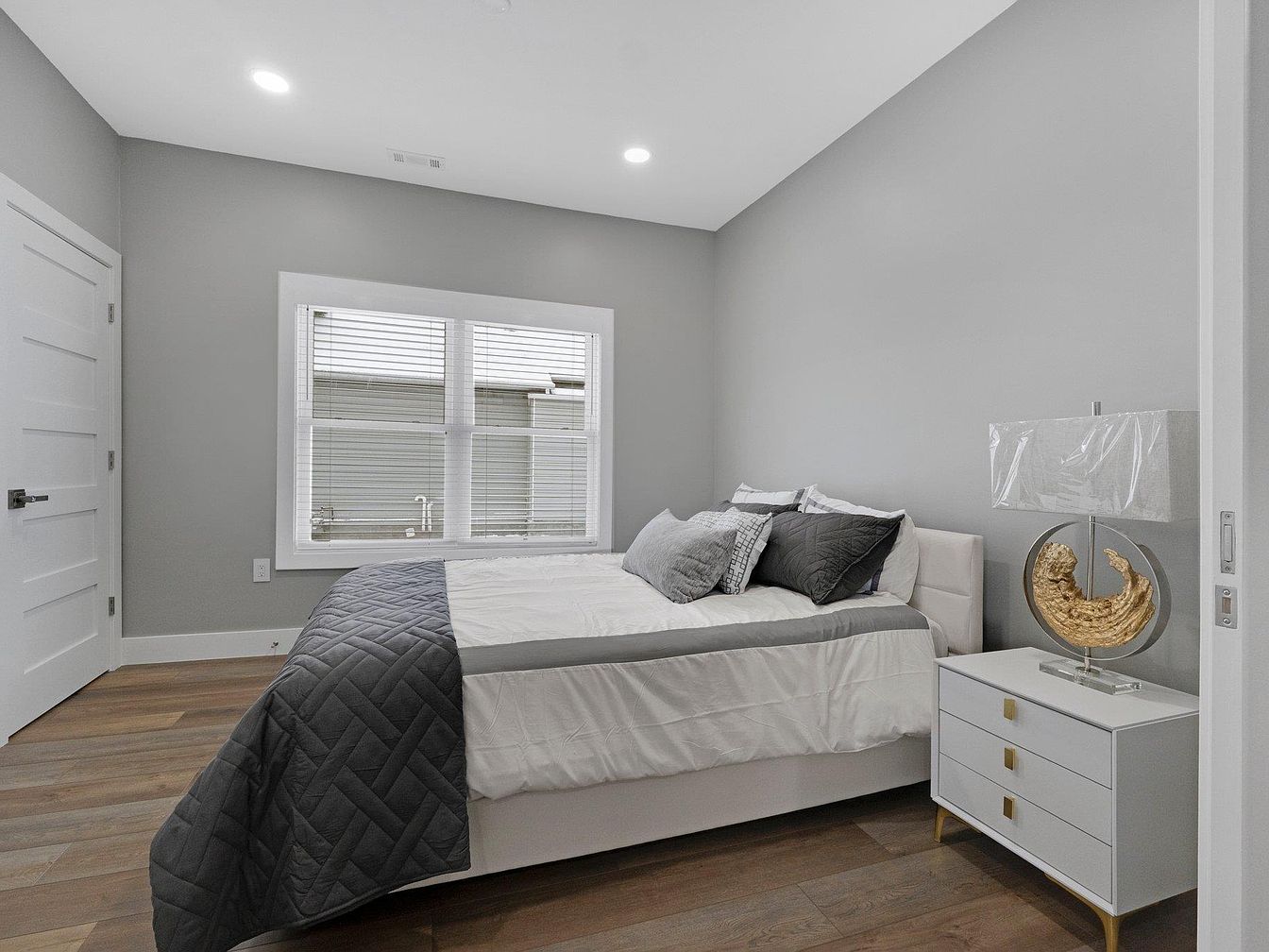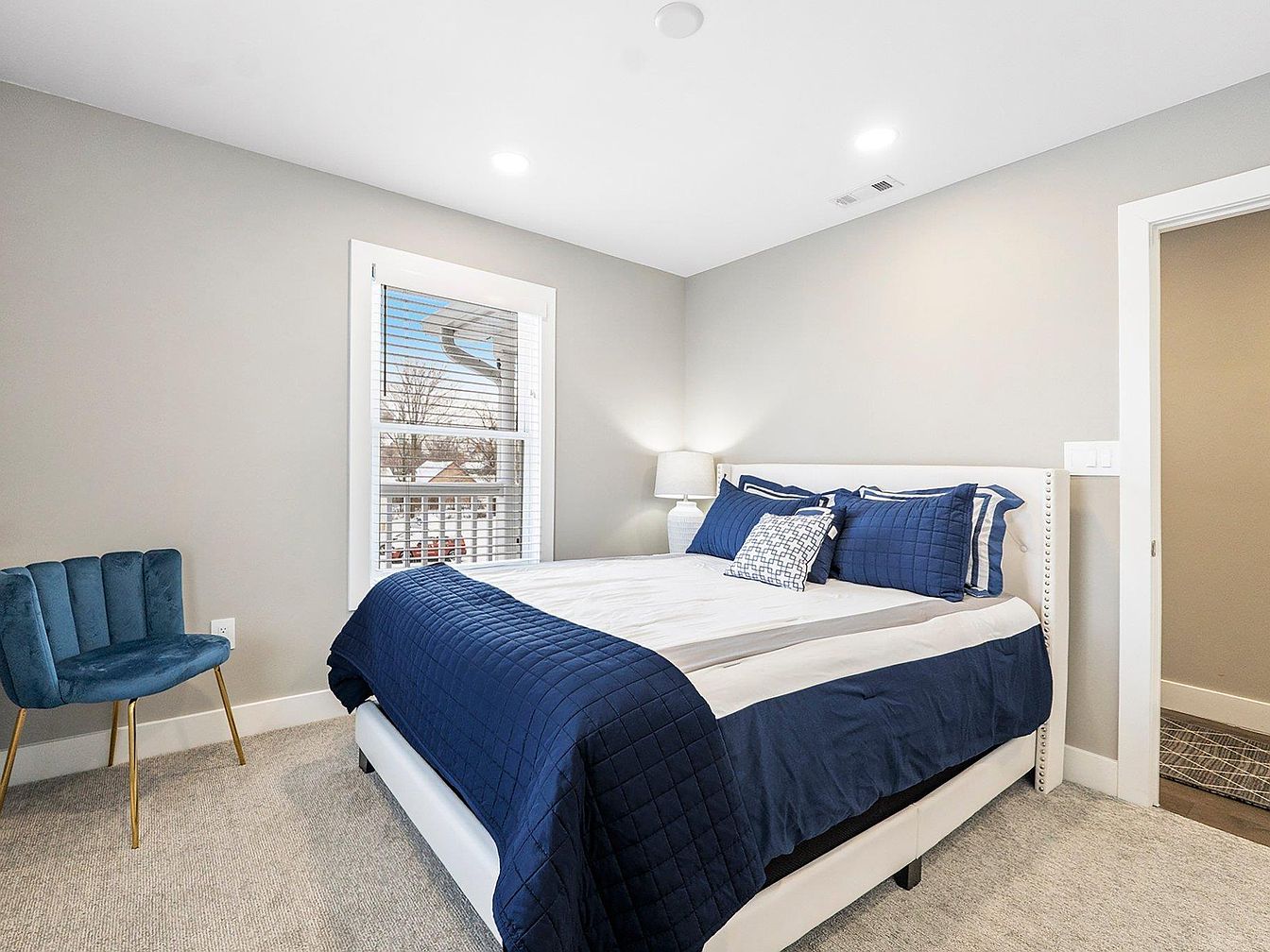 A serene bedroom features a large bed with crisp white and navy blue bedding, including several pillows for added comfort. The room is painted soft gray, complemented by plush light gray carpeting throughout. Next to the window sits a modern velvet chair upholstered in deep blue with slim gold legs. A white nightstand holds a white lamp with soft light in the corner, enhancing the cozy atmosphere. Natural light pours in through the window with white trim, offering views of the neighborhood. Minimalist and uncluttered, the space exudes contemporary style and inviting calmness.