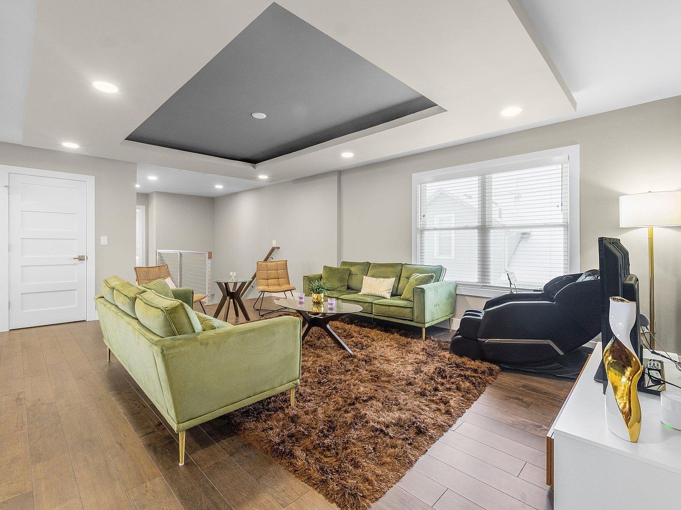 A spacious living room with contemporary design features pale beige walls, medium-toned wood plank floors, and a dramatic recessed ceiling area painted a dark gray. The room is furnished with two matching lime green velvet sofas facing each other across a plush brown shag rug, and accompanied by a glass-topped coffee table. Two woven tan chairs with metal legs add extra seating beside a modern staircase. A black massage chair sits near a large window that fills the space with natural light, and a white media console with gold-accented decor sits opposite the seating area. The overall atmosphere is bright, inviting, and modern.