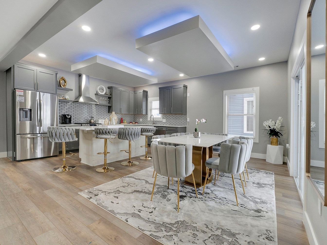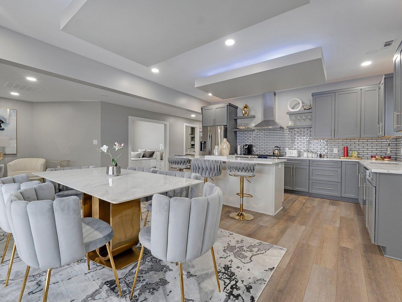 Open-concept kitchen and dining space with a modern aesthetic, featuring gray cabinetry, sleek stainless steel appliances, and a white subway tile backsplash. The kitchen island has two plush bar stools with gold bases. Adjacent, a marble dining table surrounded by eight velvet-upholstered chairs in light gray sits atop a contemporary area rug with abstract patterns. The room is illuminated by recessed ceiling lights, and soft neutral paint colors unify the walls. The flooring is wide-plank wood with a natural finish, lending warmth, while metallic accents and minimalistic decor contribute to an elegant, cohesive design.